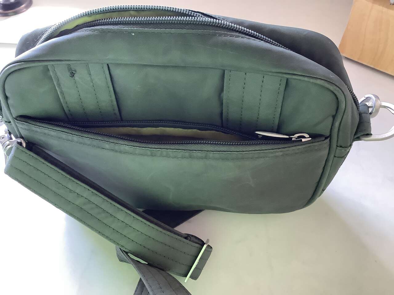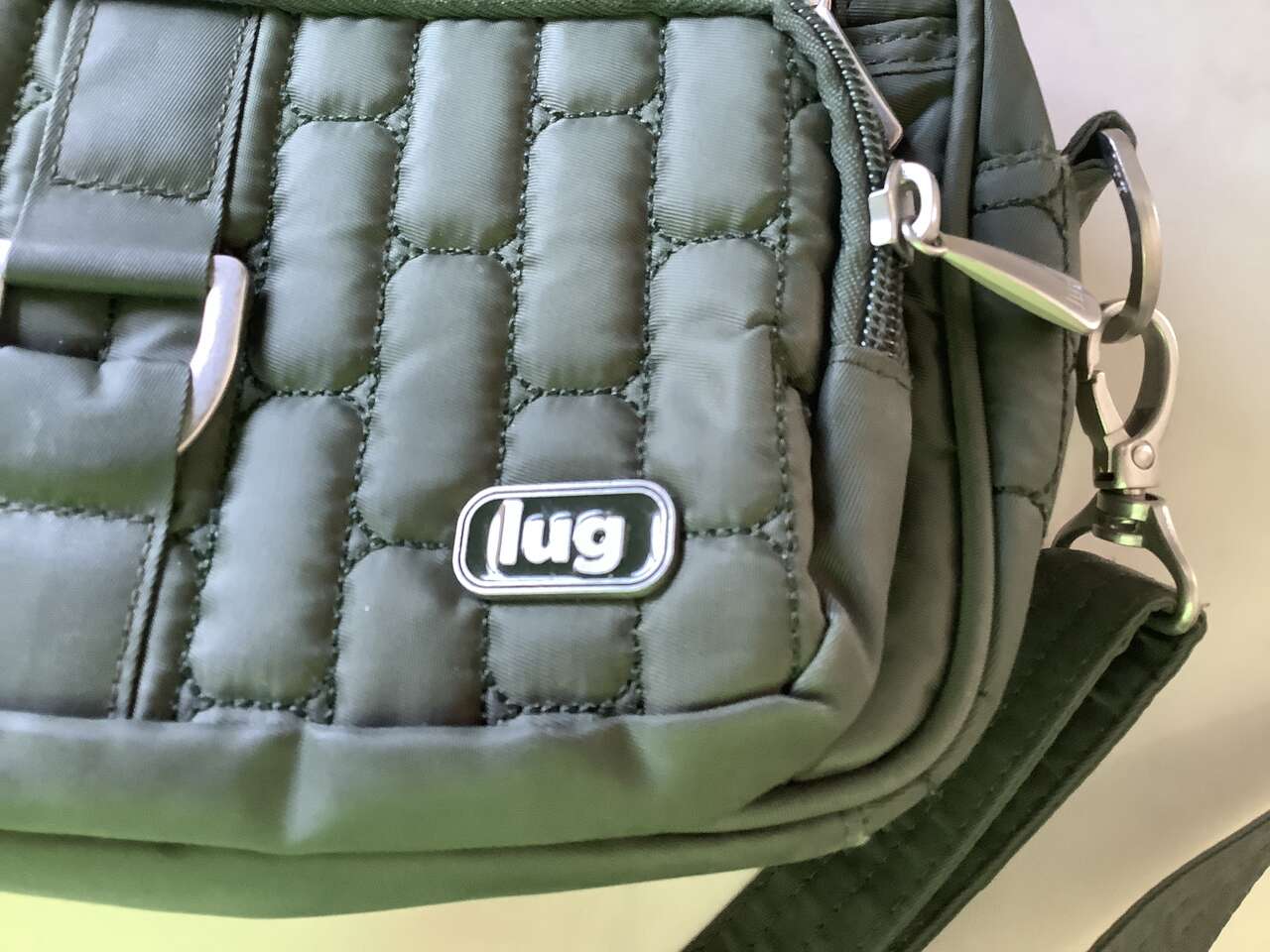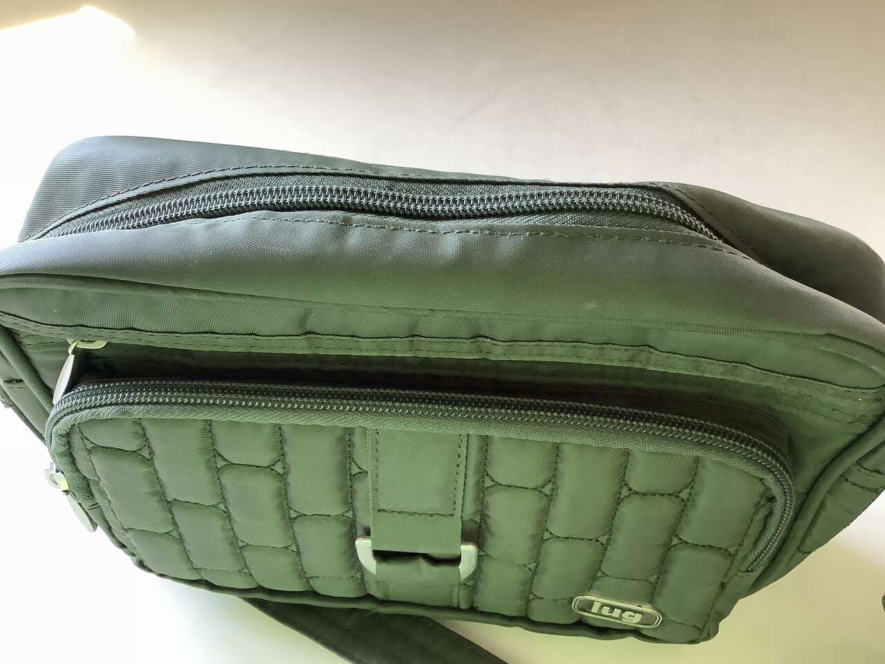 Olive green, only used twice, looking online, they sell new for $69 plus tax and shipping. Zippered compartments and inside organizing pockets. Inside is a yellow green. Strap is removable and adjustable. It's really well made. See pictures for dimensions. Cash Only Please and No Codes