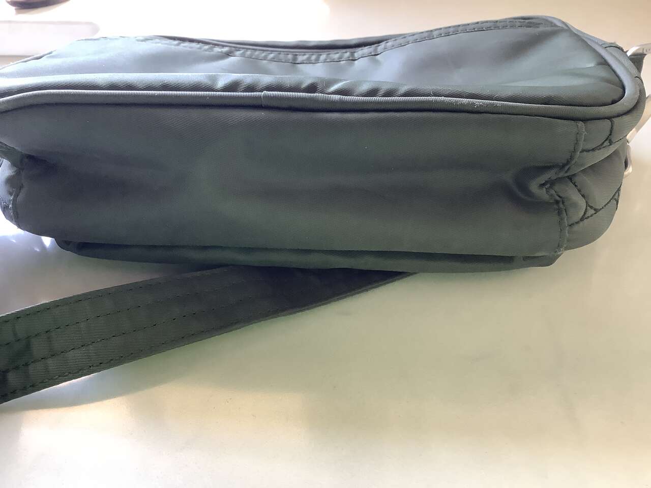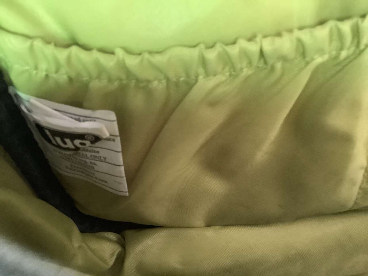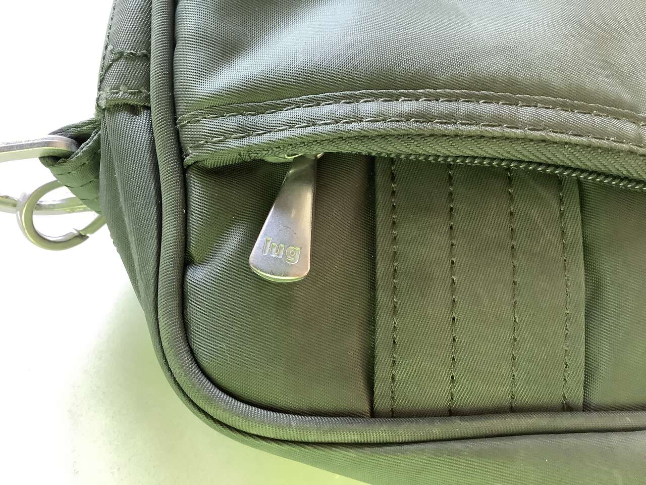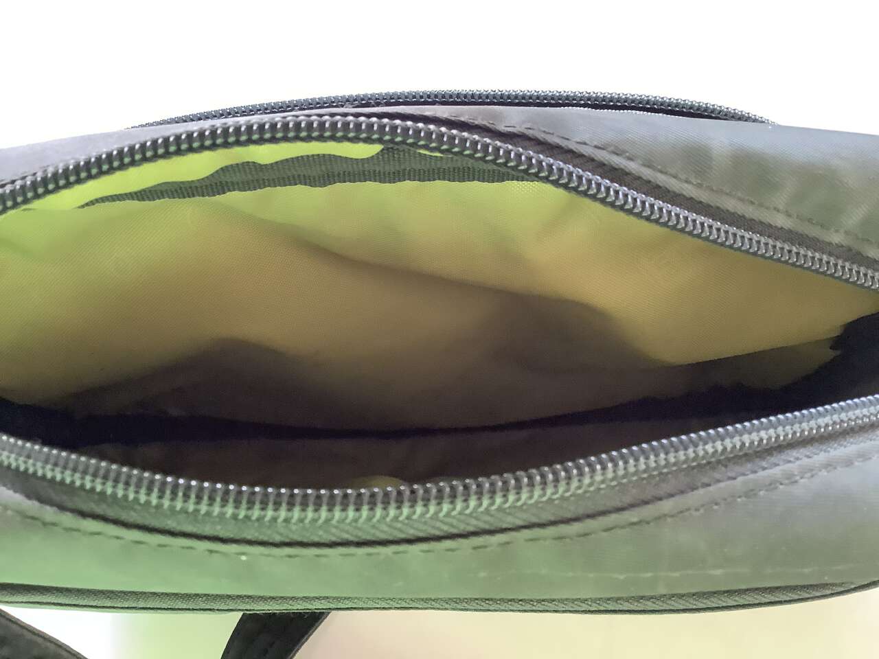 Olive green, only used twice, looking online, they sell new for $69 plus tax and shipping. Zippered compartments and inside organizing pockets. Inside is a yellow green. Strap is removable and adjustable. It's really well made. See pictures for dimensions. Cash Only Please and No Codes