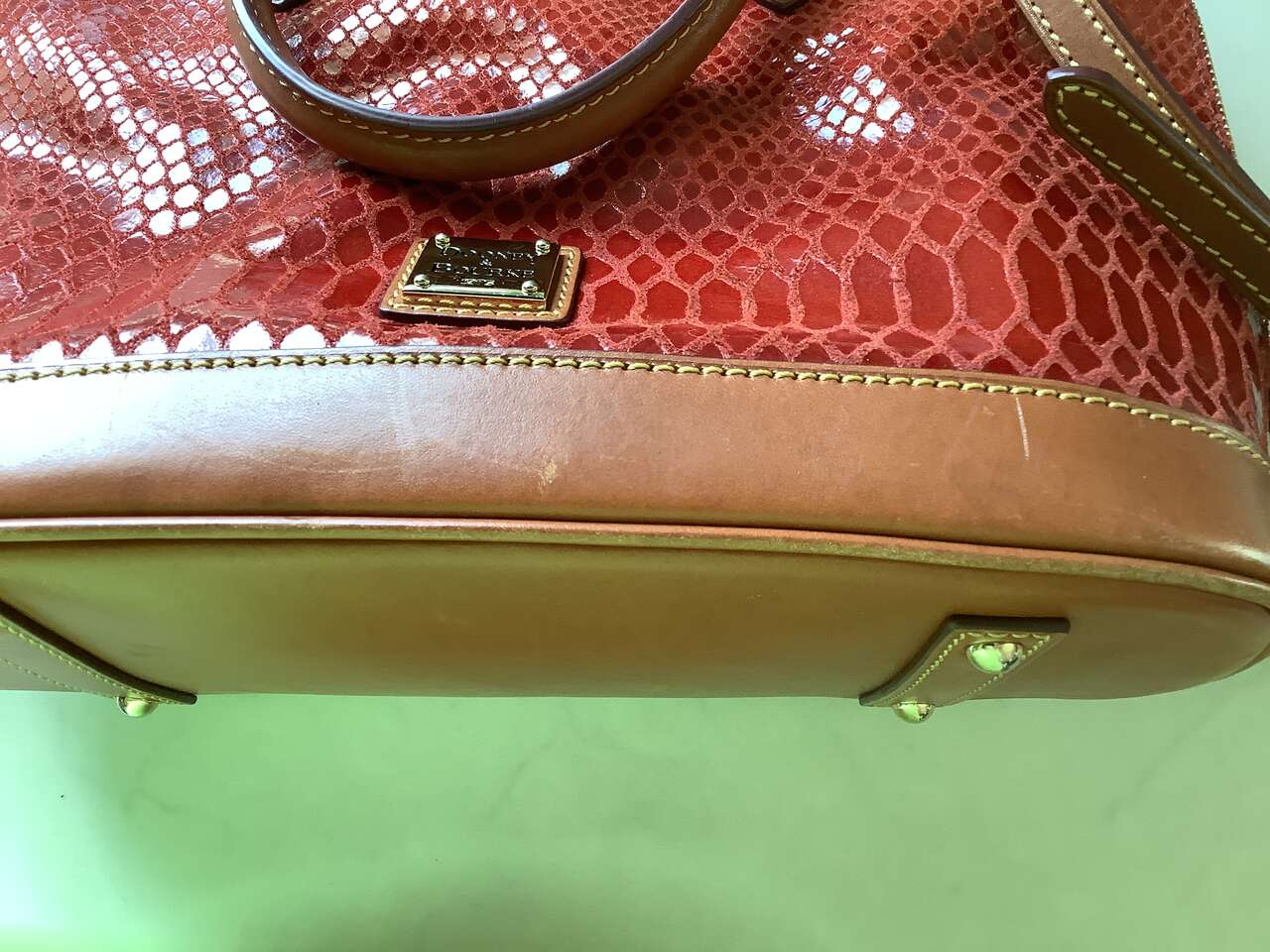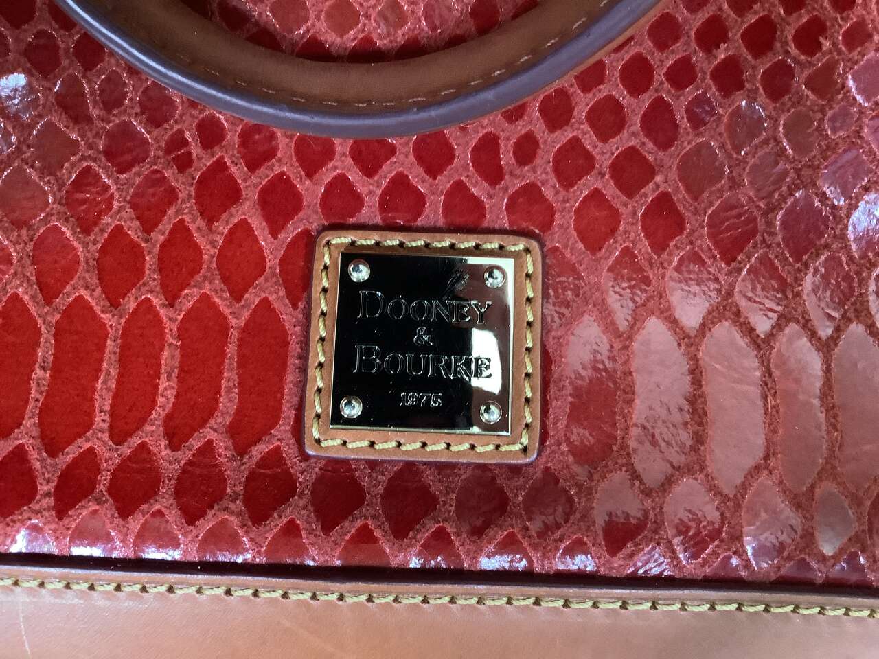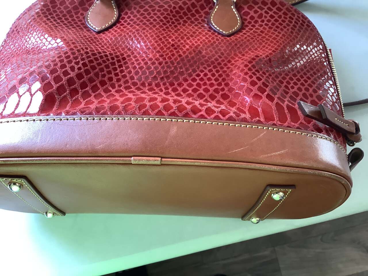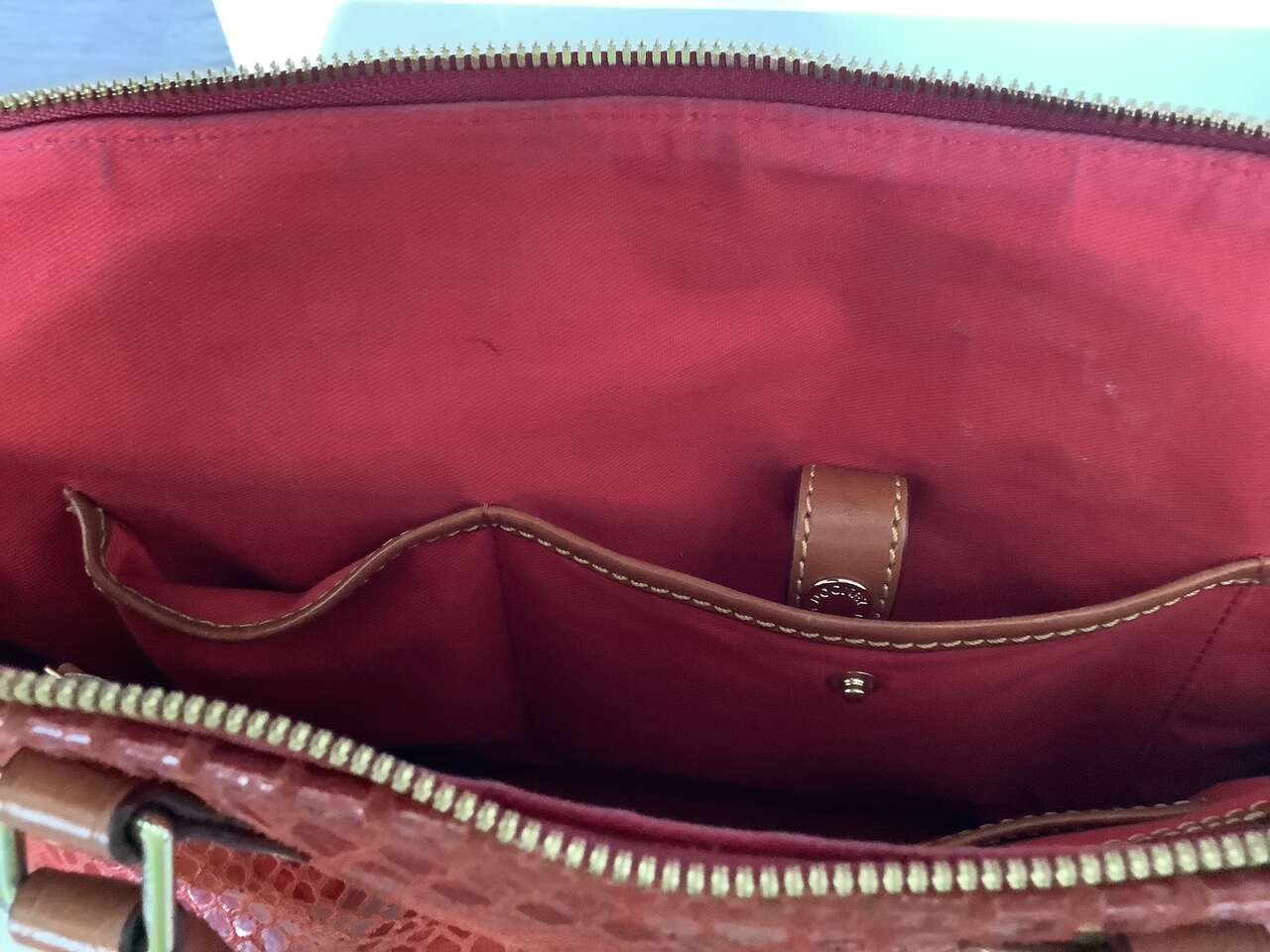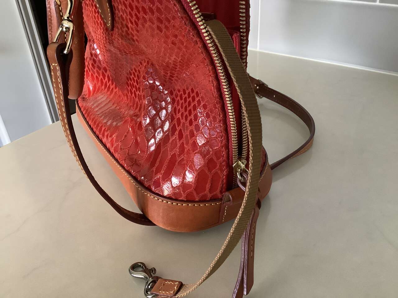 Red, leather, snake print, with brown accents, has an attached key finder inside. Makes it easy to find you keys! New they sell for $278. Removable, adjustable strap. Couple scuffs along the bottom as seen in picture, no wear on handles and bottom. Inside is red fabric. It never fit my wallet well And the only reason I'm selling. Red really is an impact and is a popular color. Measurements are included in pictures. Cash Only Please and No Codes