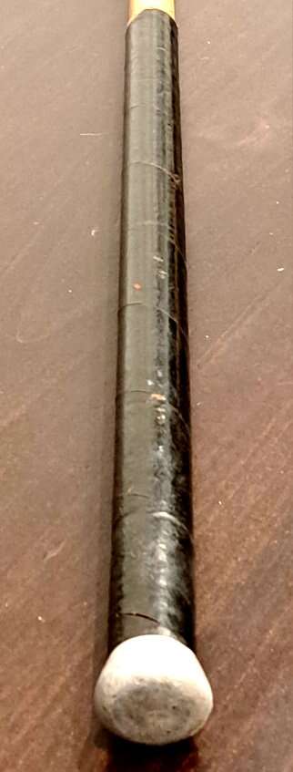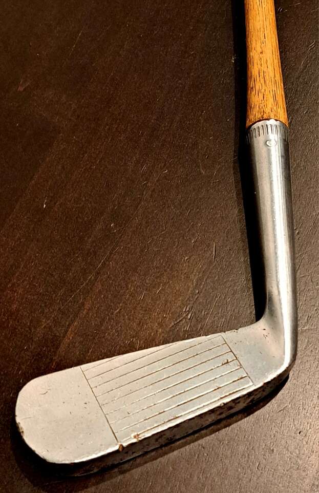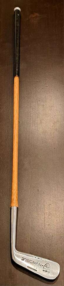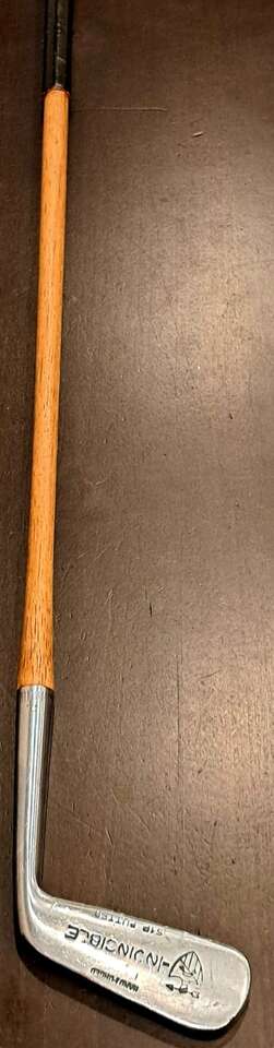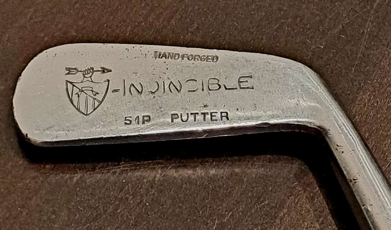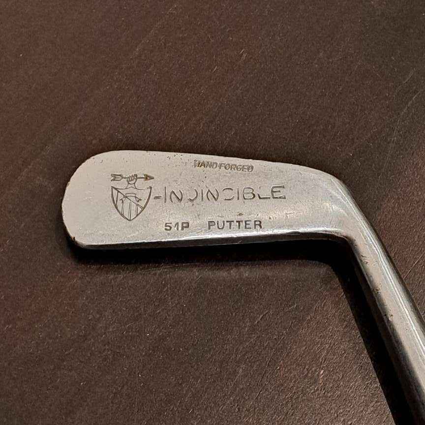 Rare 1910-1925 Invincible 5IP putter. It features a bent neck, measures 33" to the heel, hickory shaft, and leather wrapped grip. The putter comes in good condition, marked "Invincible" and "handforged". $70 Cash
