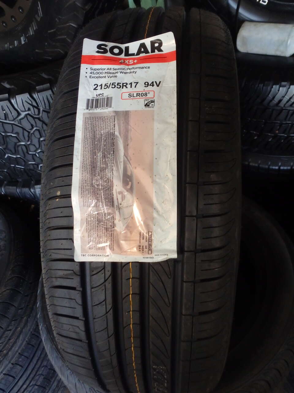 J&J TIRES & WHEELS SET OF BRAND NEW TIRES 215/55R17 SOLAR 4XS FOR ONLY $300 THESE IS A GREAT TIRES FOR ANY WEATHER CONDITIONS, WE WILL INSTALL THEM FOR AN ADDITIONAL $20.00 PER TIRE INSTALLATION INCLUDES BALANCING,VALVE STEAM AND TIRES DISPOSAL FEE,CALL FOR ANY QUESTIONS AT JOSE OR ROBERTO 801-878-4556 801-410-4460 OR VISIT US,WE'RE OPEN MONDAY TO SATURDAY FROM 9:00 AM TO 6:00 PM..WE HAVE A LOT'S A MORE AN NEW TIRES AND WHEELS CALL US IF YOU ARE LOOKING FOR A DIFFERENT SIZE....