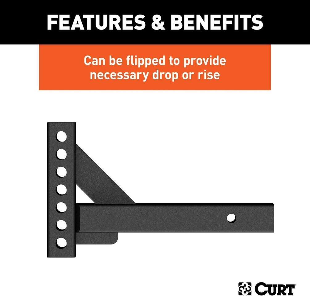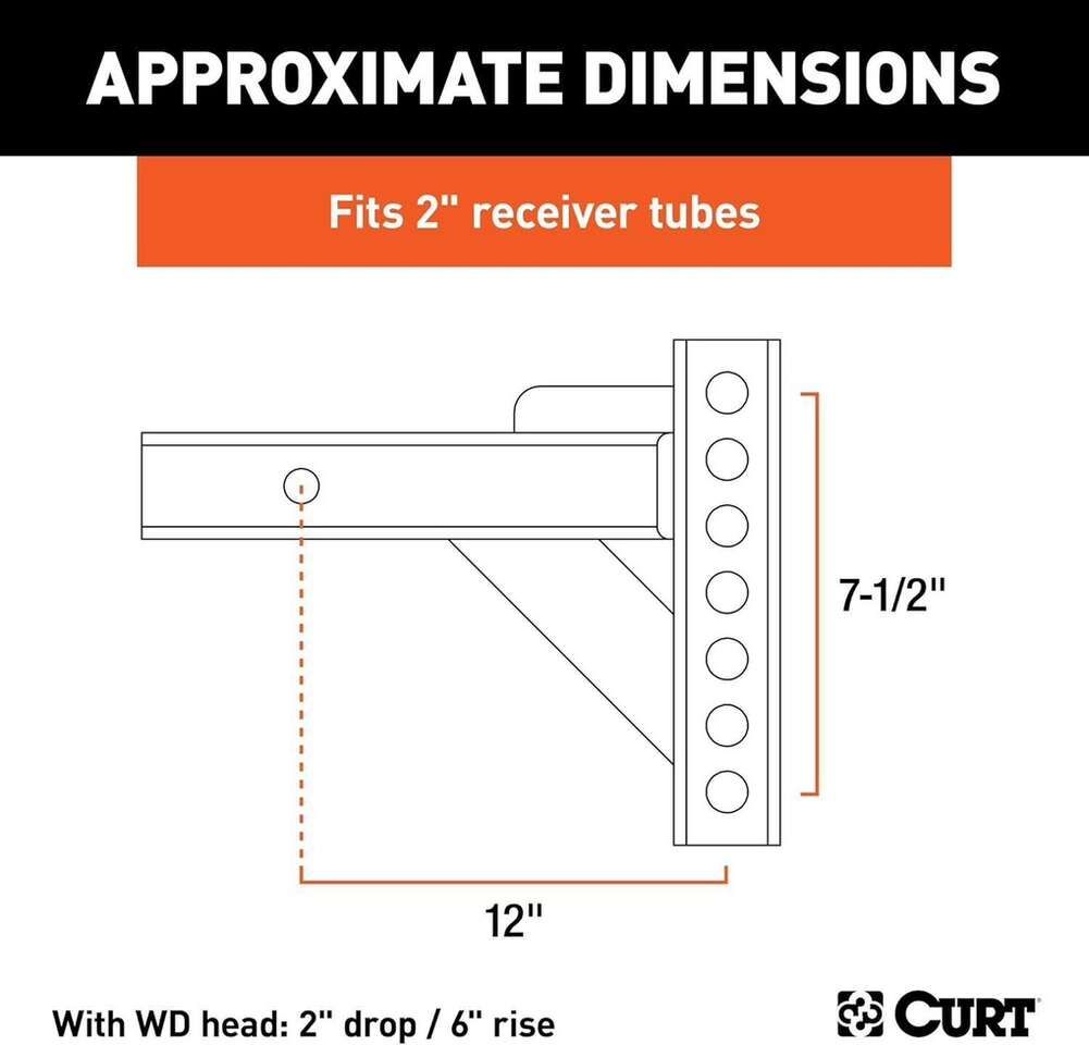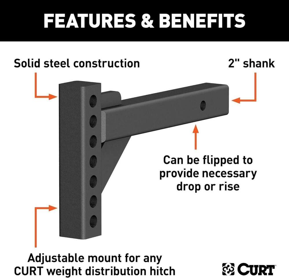 Fits 2-inch x 2-inch receiver tube openings with 5/8-inch hitch pin hole, and is compatible with any CURT weight distribution hitch Provides a maximum drop of 2-inch and a maximum rise of 6-inch Features multiple 3/4-inch diameter holes, spaced 1-1/4-inch from center to center, for adjustable head height Constructed from solid steel for reliable strength and protected by a durable powder coat finish (weight capacity limited to spring bar capacity).