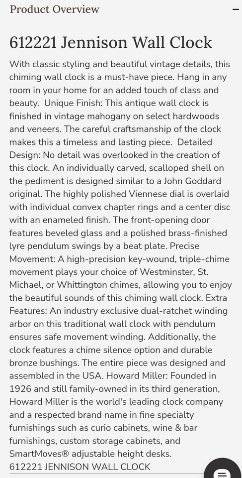 ZelleFor the clock enthusiast, collector, or a piece to add to your home. Please read all the features and description of this Howard Miller timepiece posted in the photos. There are some imperfections on the wood as shown in photos. It has not been used for a while yet can last a lifetime.