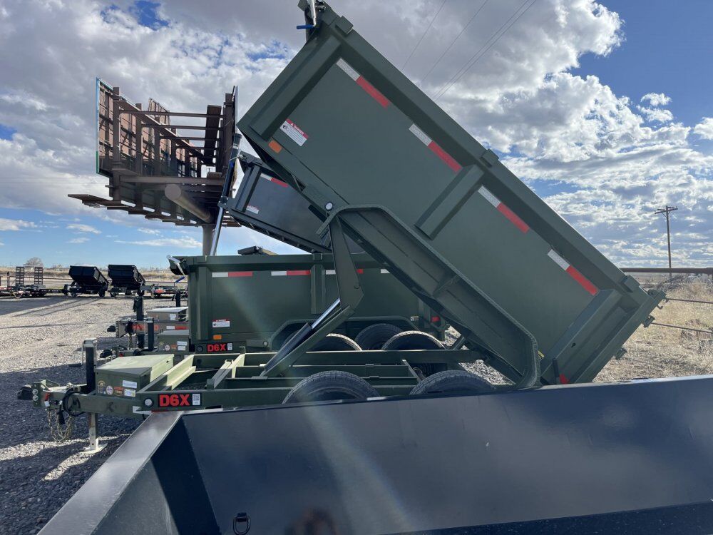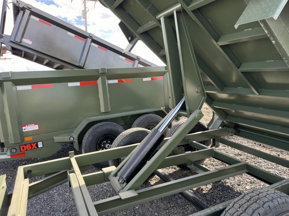 2-5200 pound brake axles, 2 5/16 adjustable coupler, 5" channel wrap tongue with toolbox, 5"x20" scissor hoist, 3" channel on 16" centers, 3' solid sides, split/spreader tailgate, ST235/80R16 E 10 ply radials, double broke diamond plate fenders, 10 gauge floor and sides, flush mount LED lights with sealed wire harness, corded and wireless remote, pull back tarp system, 12 volt AGM battery, 5 amp Noco charger, spare mount, Army green powder coat paint, 5 year frame warranty