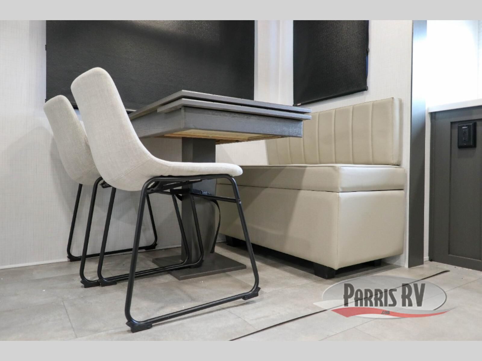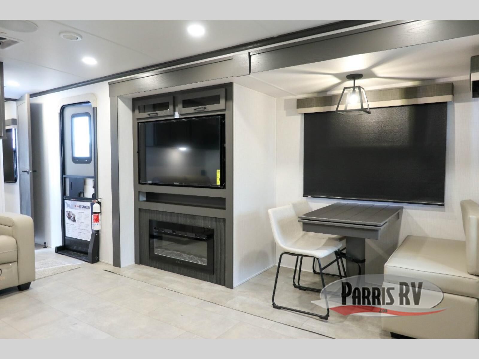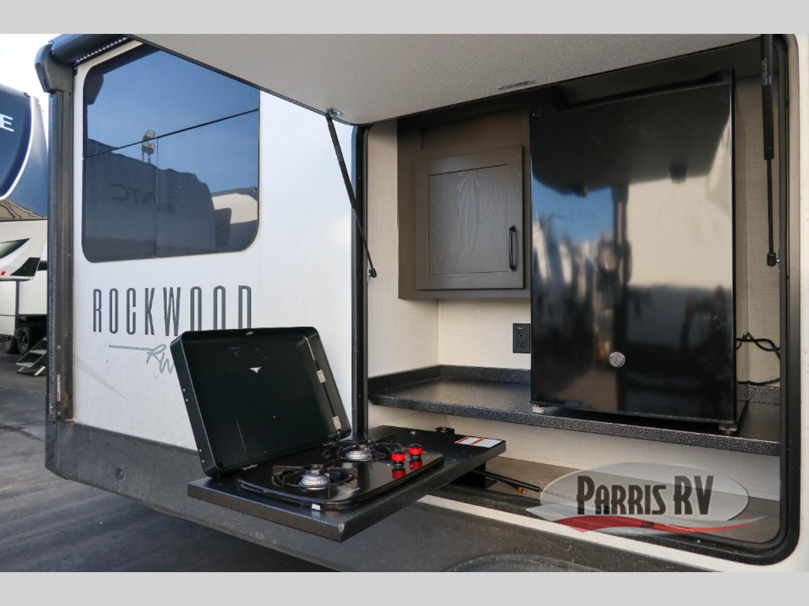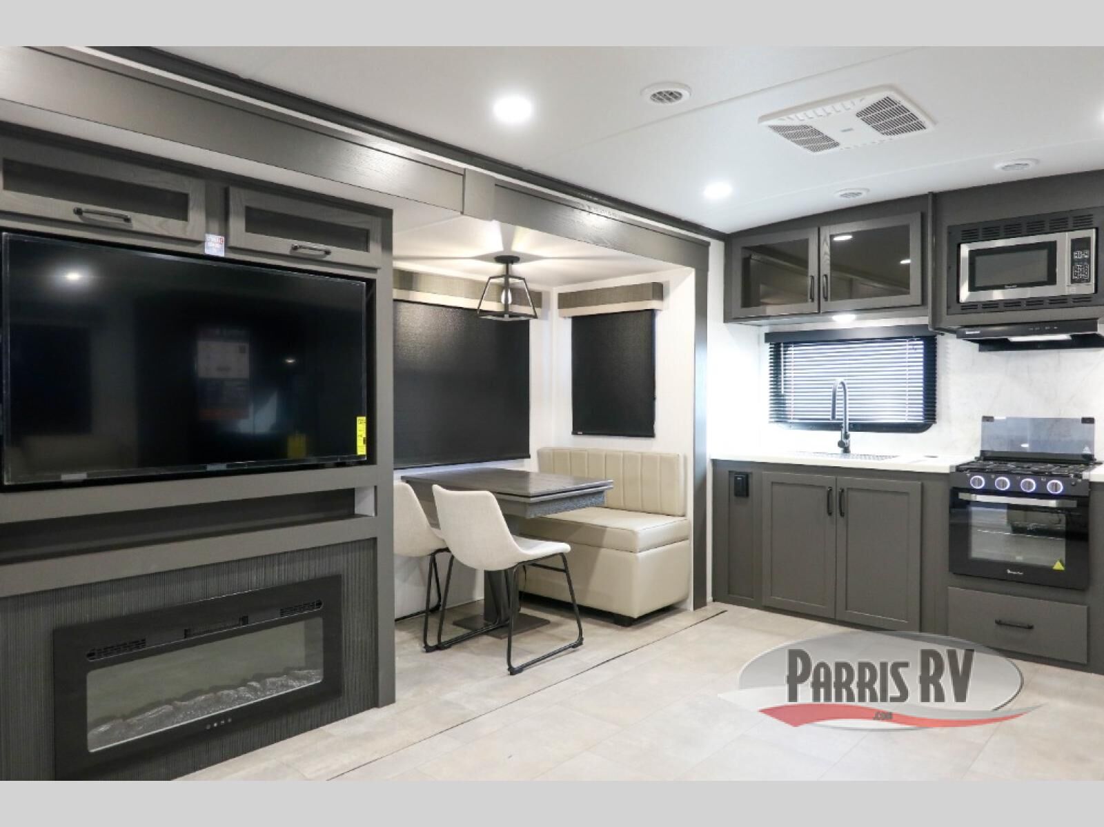 One step inside this rear kitchen travel trailer and you'll be sold! The dual opposing slides create an open floorplan you are sure to love, and you'll find plenty of seating spaces on the theater seat, the hide-a-bed sofa, and at the booth dinette. There is an entertainment center here with a Smart TV, plus a fireplace for those cooler nights. The full bath includes a shower with a seat, and the front private bedroom includes a queen bed slide out for more floor space. You can easily store your items in the large front wardrobe, plus there is a dresser and additional storage with washer and dryer prep. And check out the exterior with two power awnings, an outside kitchen, plus exterior storage for all your gear!