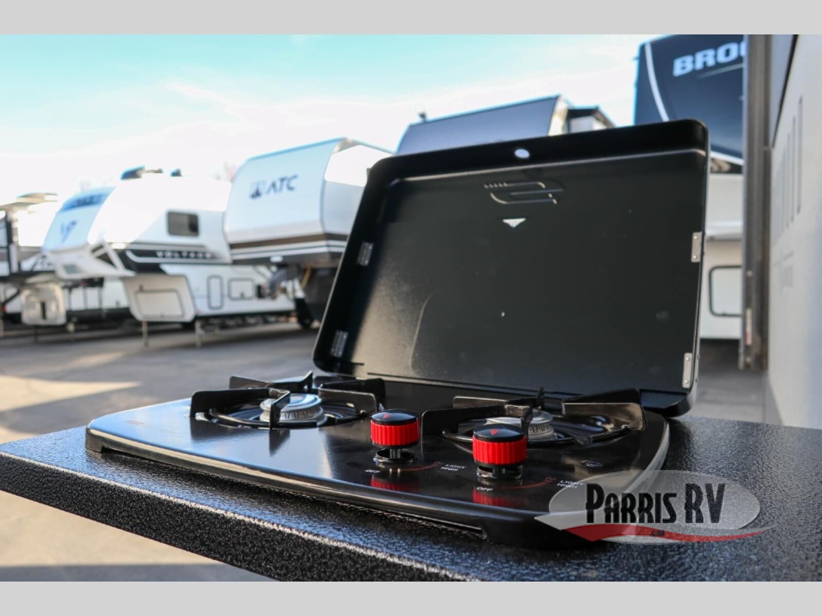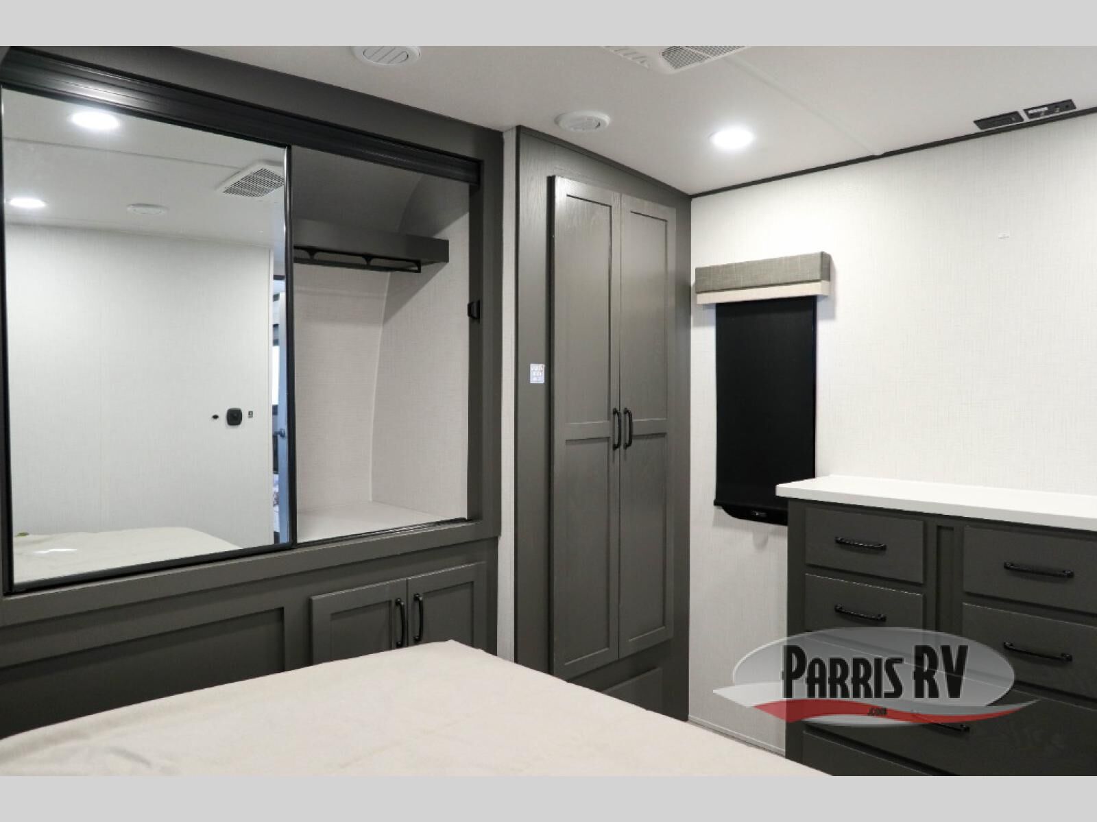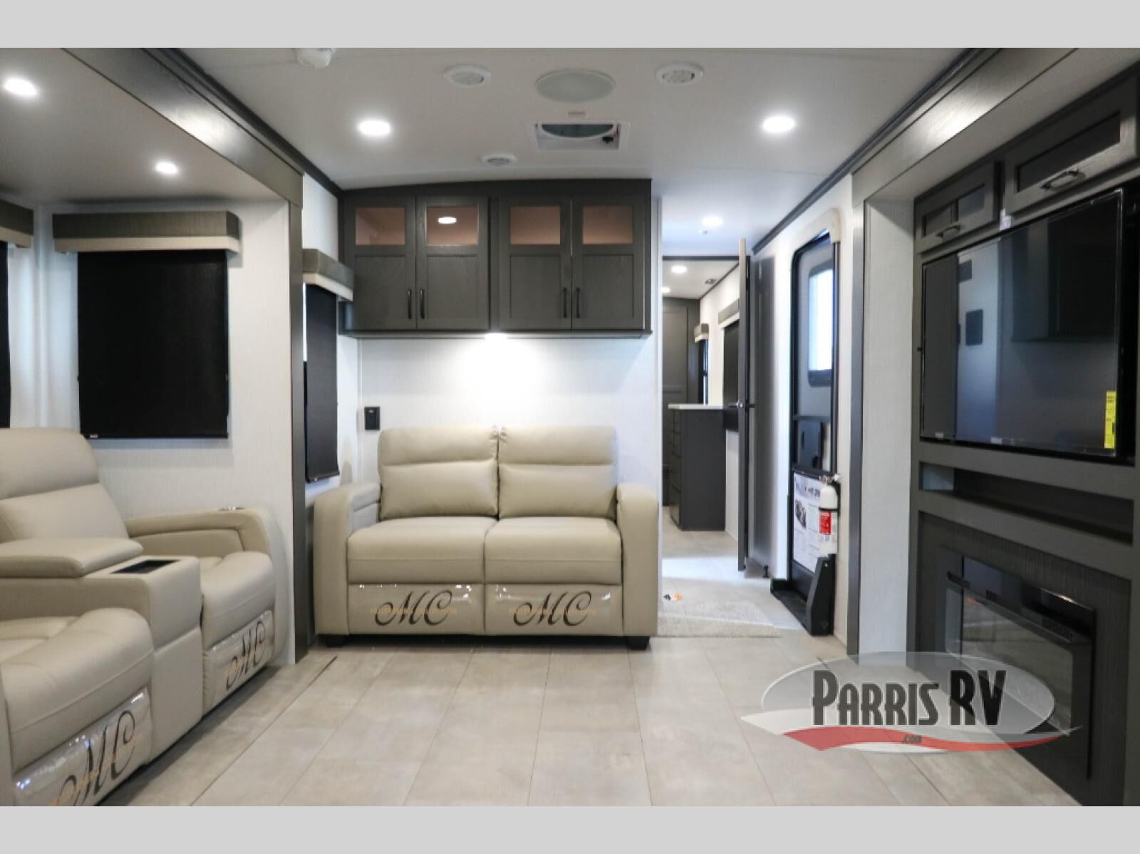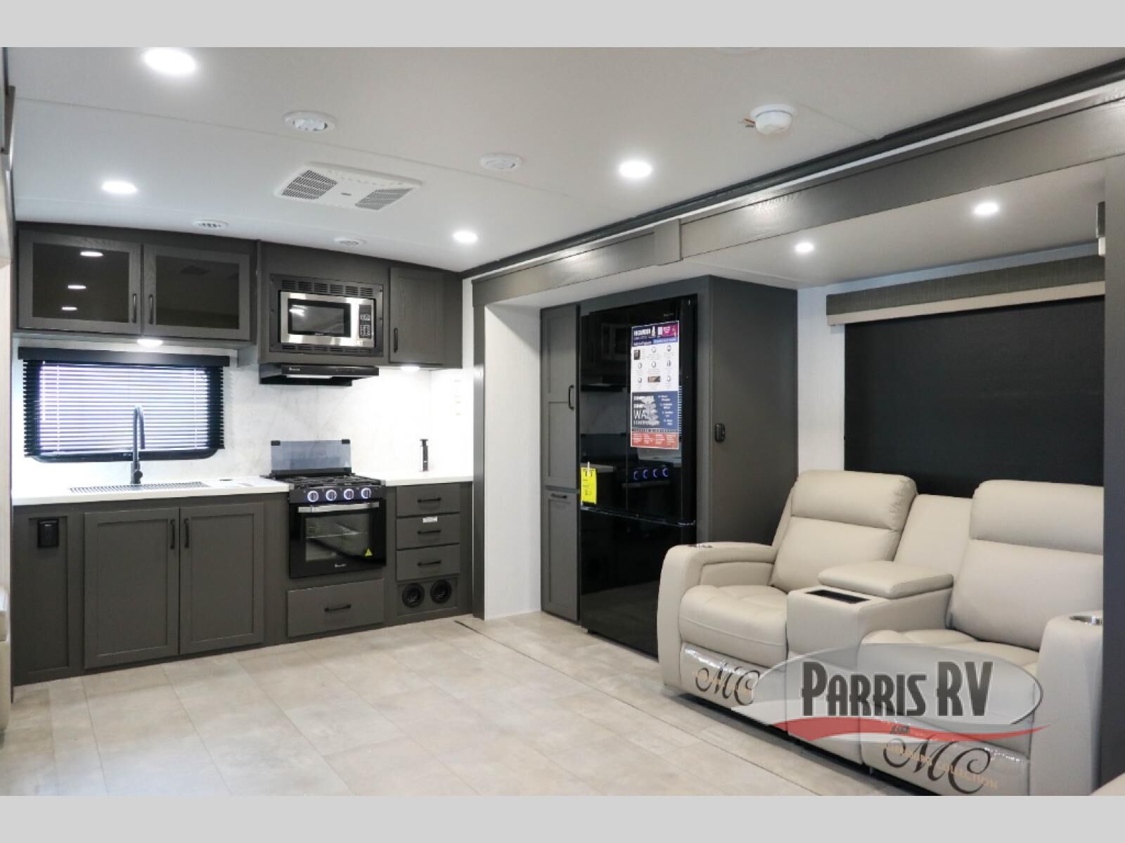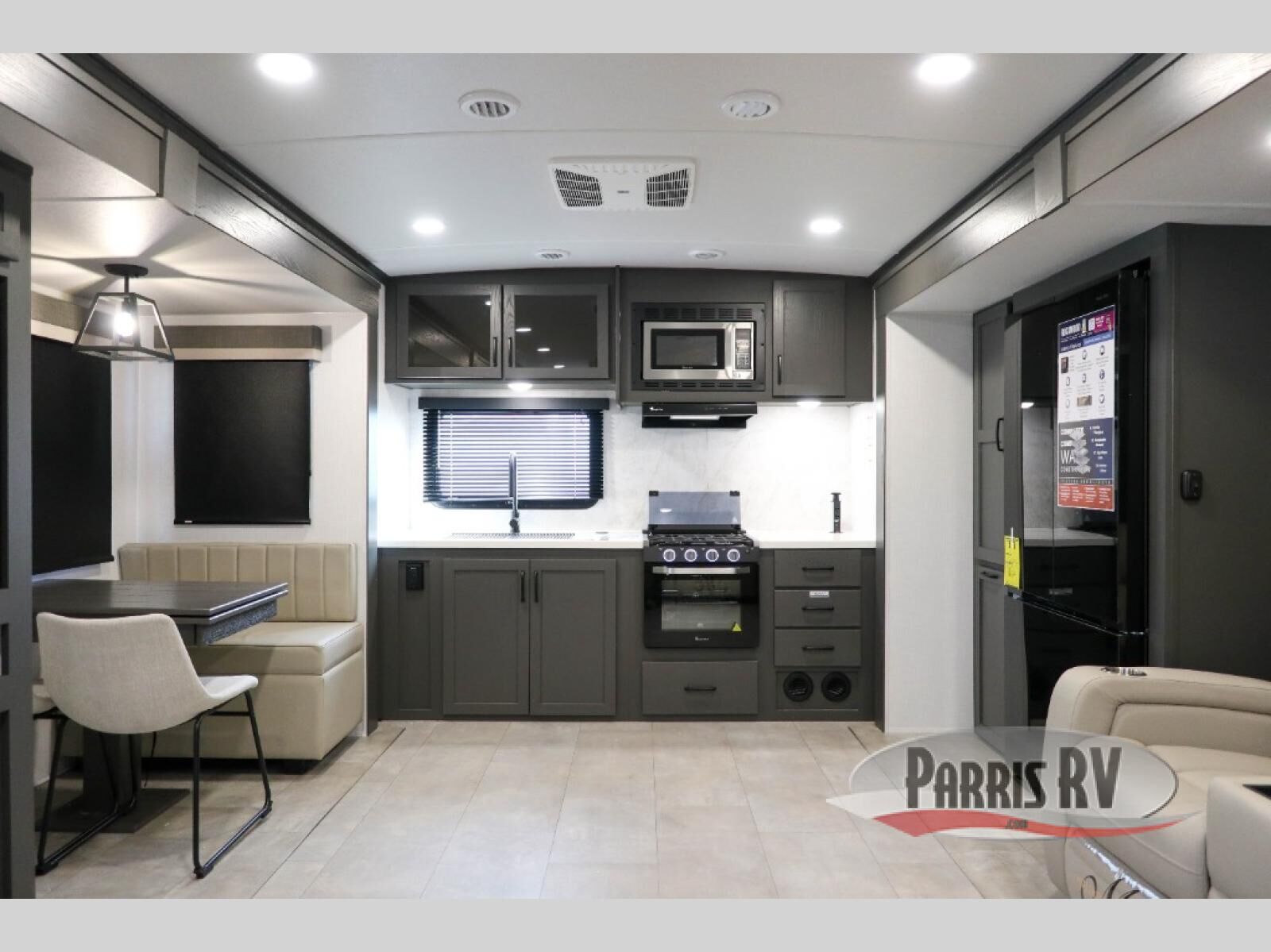 One step inside this rear kitchen travel trailer and you'll be sold! The dual opposing slides create an open floorplan you are sure to love, and you'll find plenty of seating spaces on the theater seat, the hide-a-bed sofa, and at the booth dinette. There is an entertainment center here with a Smart TV, plus a fireplace for those cooler nights. The full bath includes a shower with a seat, and the front private bedroom includes a queen bed slide out for more floor space. You can easily store your items in the large front wardrobe, plus there is a dresser and additional storage with washer and dryer prep. And check out the exterior with two power awnings, an outside kitchen, plus exterior storage for all your gear!