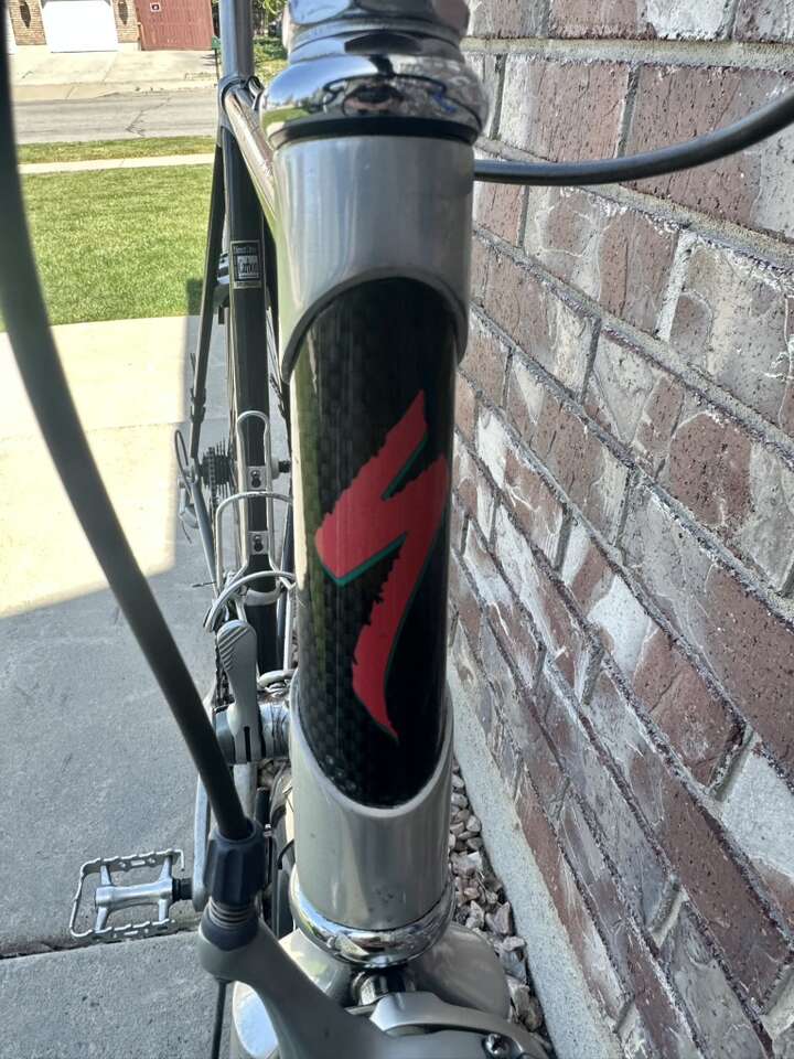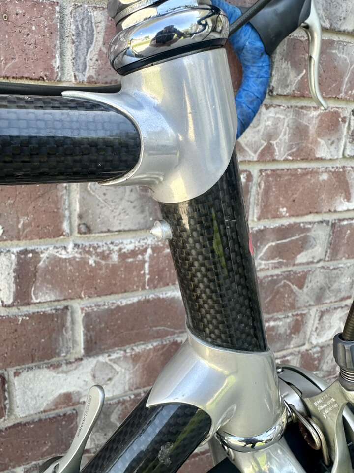 Great condition. No size indicator. 23.5” frame. 22.5” top tube. 700c wheels. 14 speeds(2x7). Wow, what a bike! Carbon with aluminum lugs. Definitely a collector.