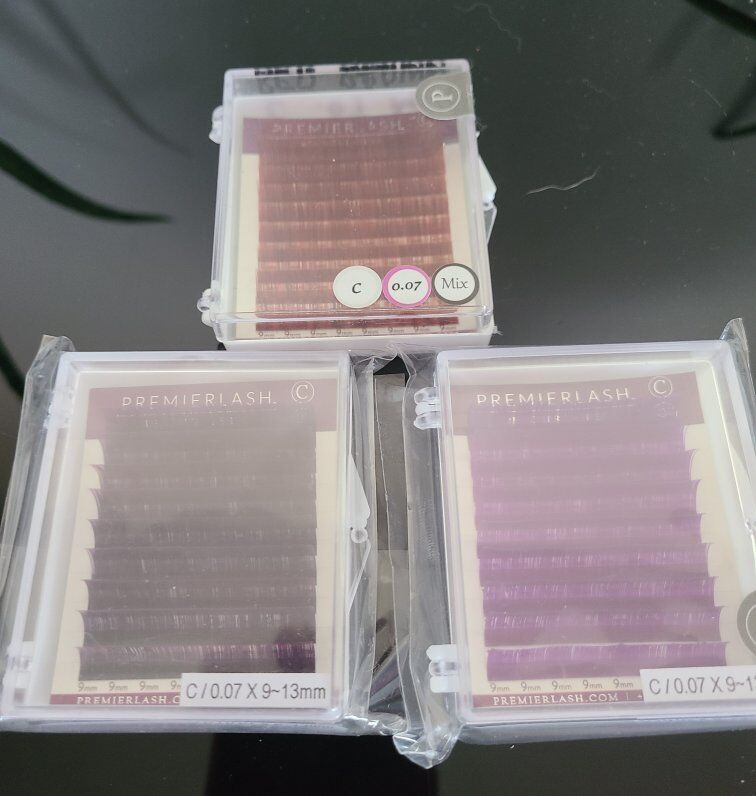 PremierLash L+ curl .05 8-14 mm mix, L+ curl .10 8-14 mm mix, C curl .10 11 mm, C curl .07 9-13 mm mix, red/brown, C curl .07 9-13 mm mix, dark purple, C curl .07 9-13 mm mix, purple,