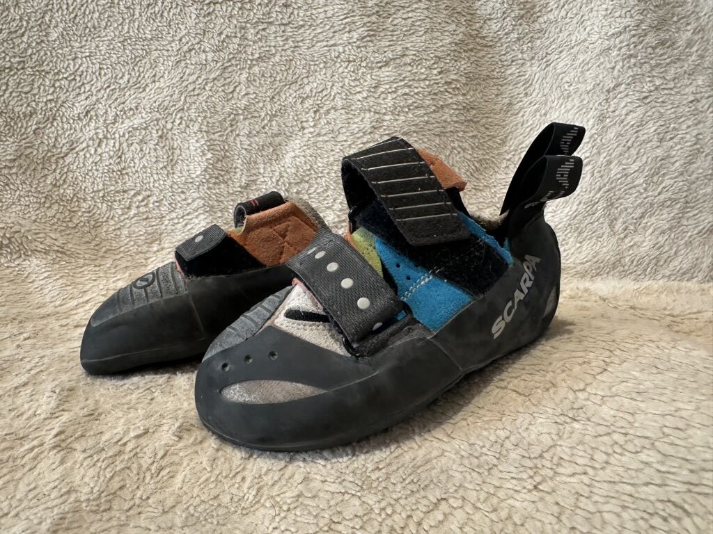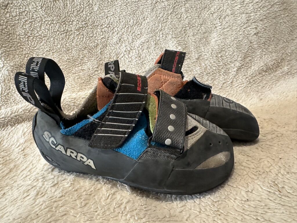Scarpa Boostic youth size 4 blue/green/orange climbing shoes with Velcro straps. These are in good condition, see photos for details. I take cash or Venmo, but cash is preferred. Text is best. 8012014446. Check out my other ads for additional sizes and styles