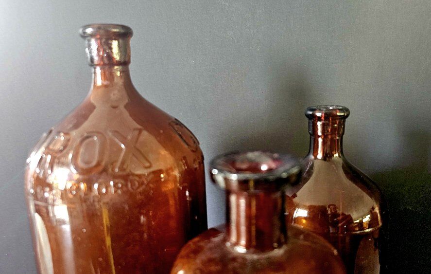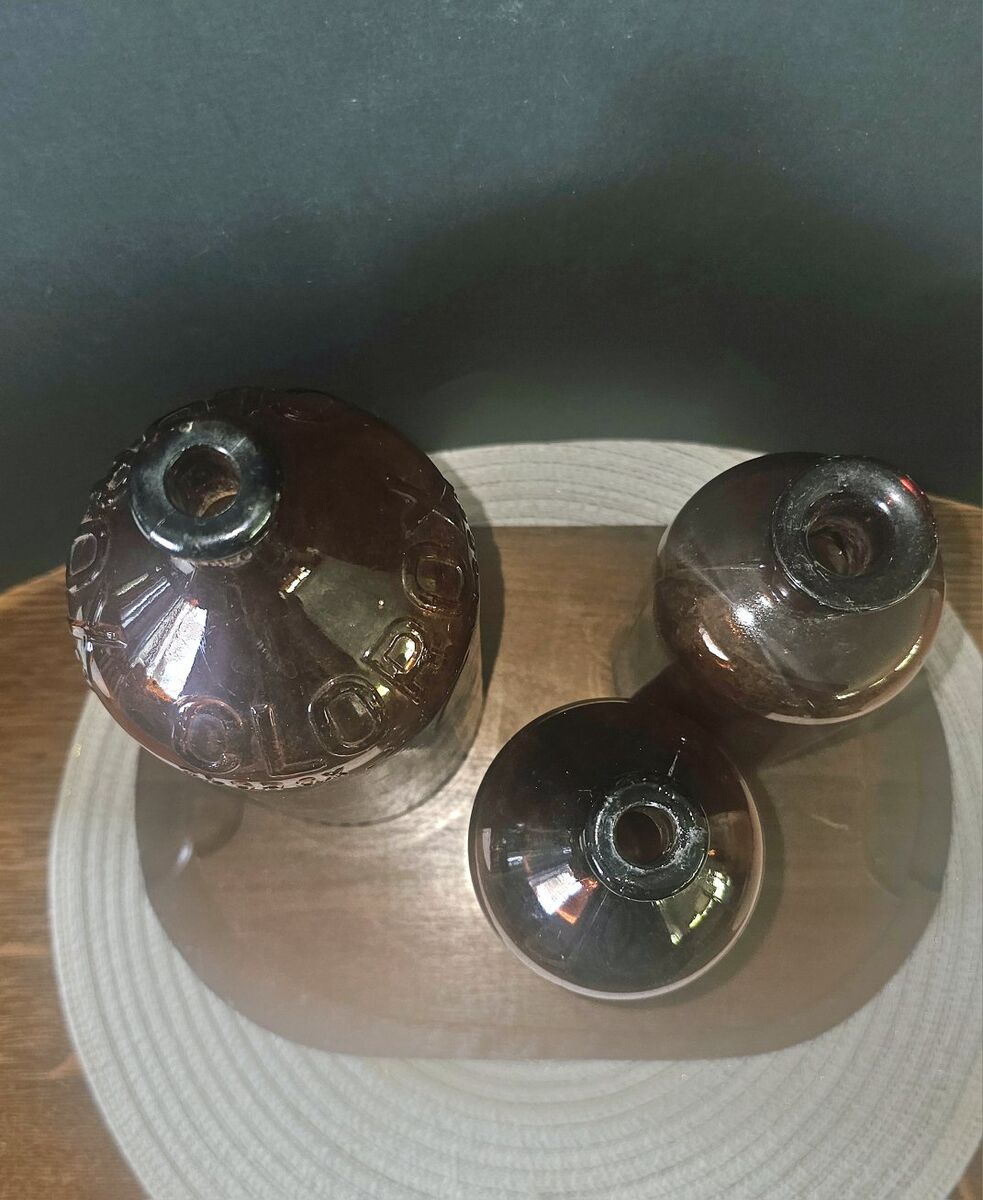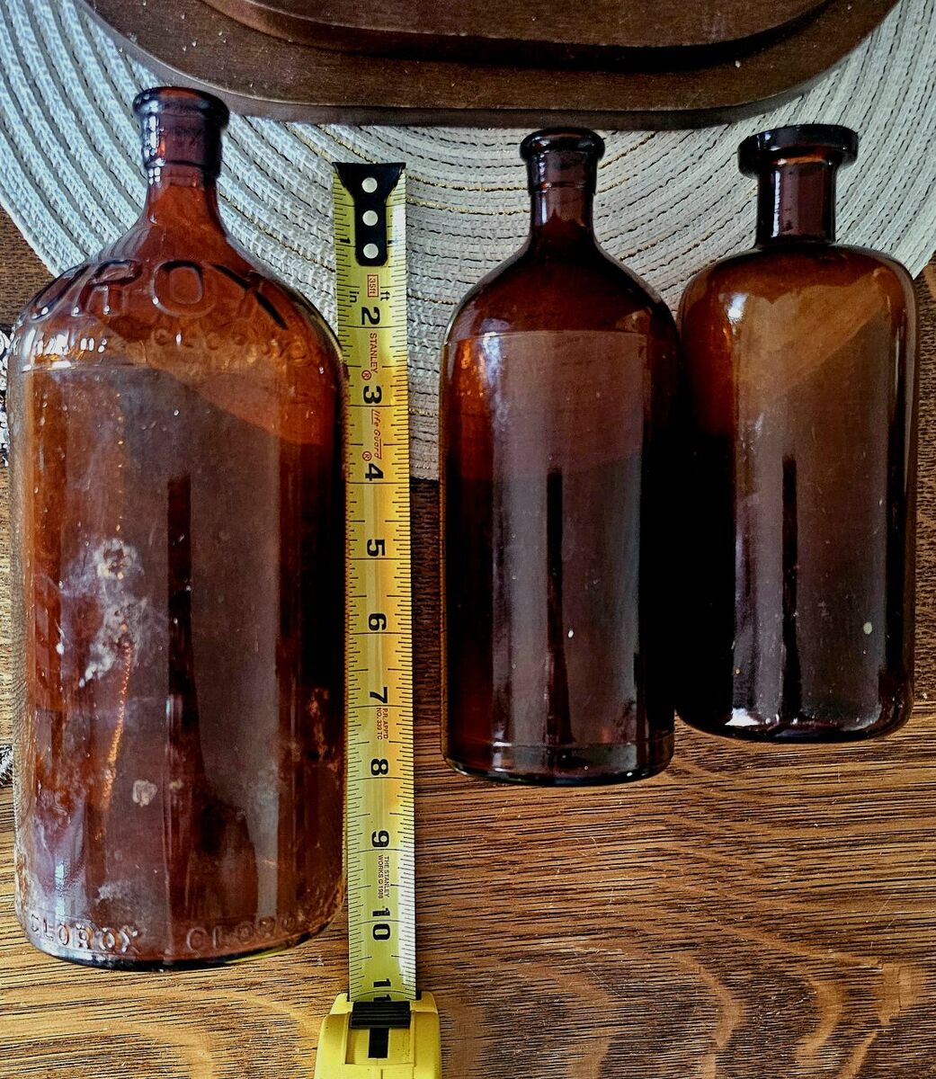 32 oz, 9.5" Clorox, 16oz, 7.75" Clorox & middle bottle with broader opening is 7.25". (see pictures) This paired trio is so nice & pleasing to the eye together. All are in perfect shape!. No chips or missing glass. Both Clorox bottles are labeled on the bottom.