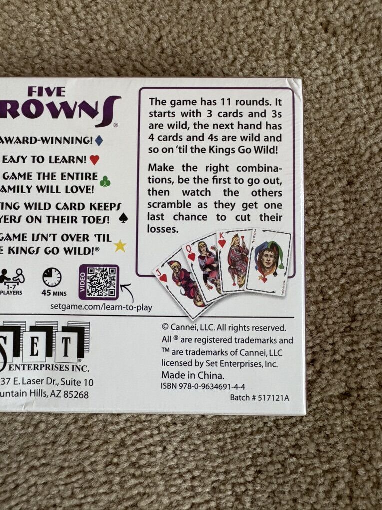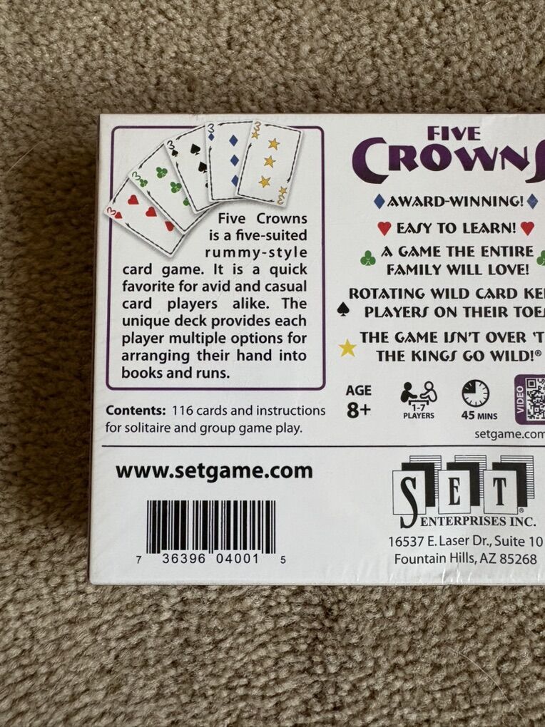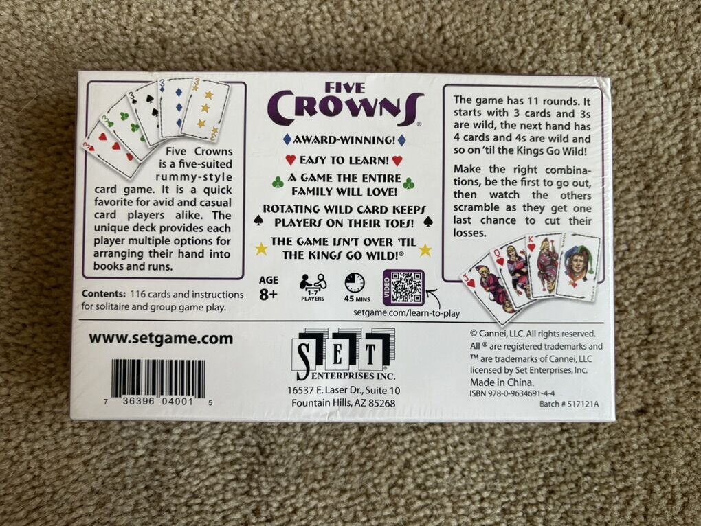 NEW (sealed in plastic) Five Crowns: The game isn’t over ‘til the kings go wild! The five-suited rummy-style card game. Award-winning game by Cannei/Set Enterprises. Age 8+, 1-7 players. New, unopened condition. Text only. Cash or Venmo.