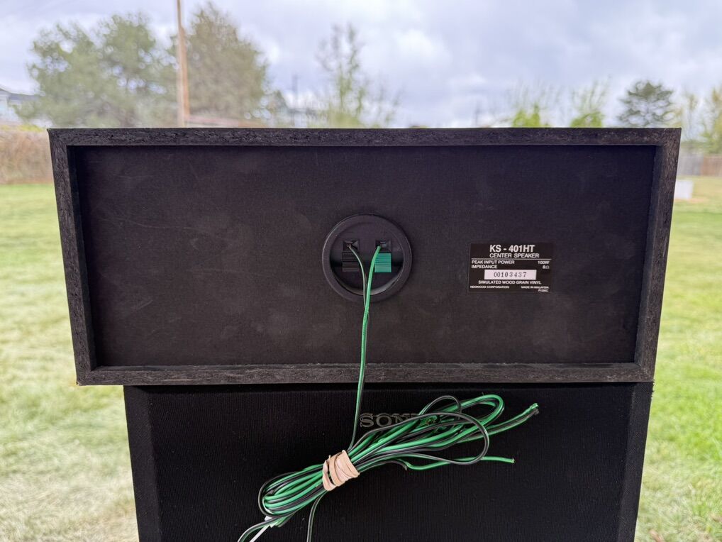 -Model: KS-401HT Center Speaker -Peak Input Power: 100W -Impedance: 8 ohms -Serial Number: 00103437 -Material: Simulated Wood Grain Vinyl -Manufacturer: Kenwood Corporation