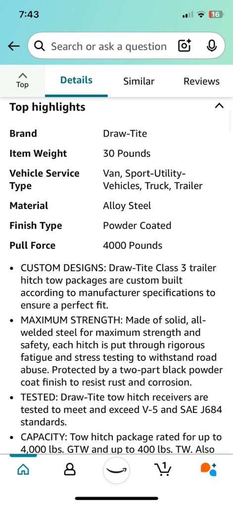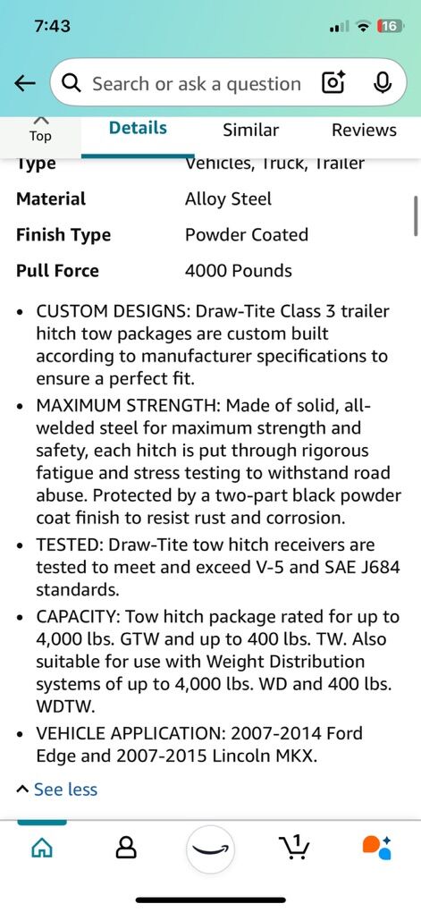 VenmoDRAW-TITE Hitch 75992 2” Max-Frame Receiver. This retails for $203 on Amazon. I do not have the fastener kit. This hitch is compatible with the Ford edge 2007-2014 and the Lincoln MKX 2007 through 2015. Perfect hitch for Holland bicycles or anything else you need . Only asking $50 because I don’t have all the nuts and bolts kit. You’d have to order that separate from a store