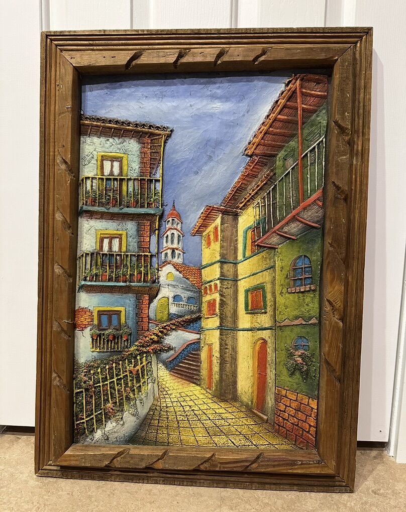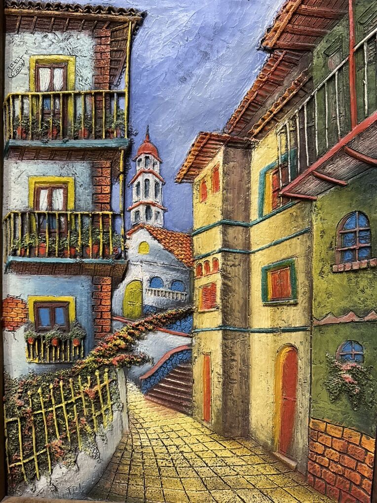 VenmoBeautiful Textured Village Art Signed by Artist. It is handmade, three-dimensional artwork, this might be a painting of a European town or village scene, possibly in a Mediterranean style.