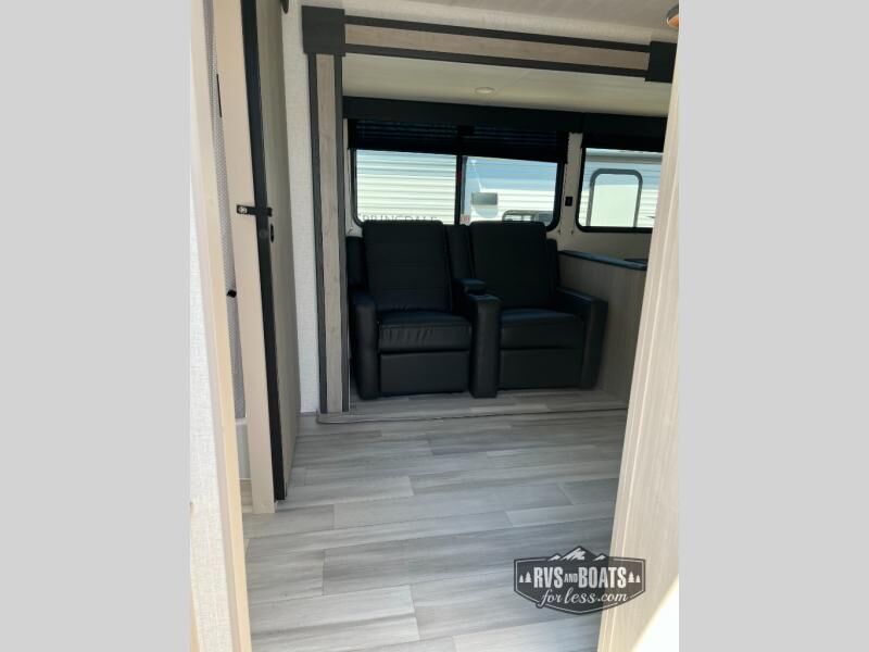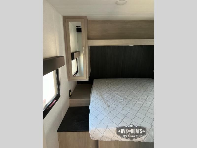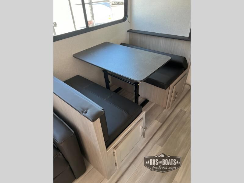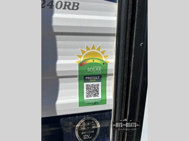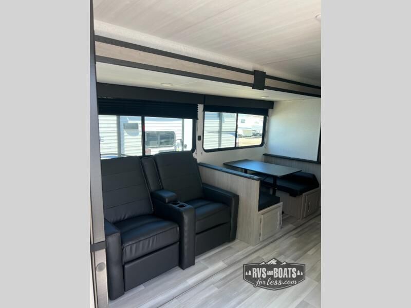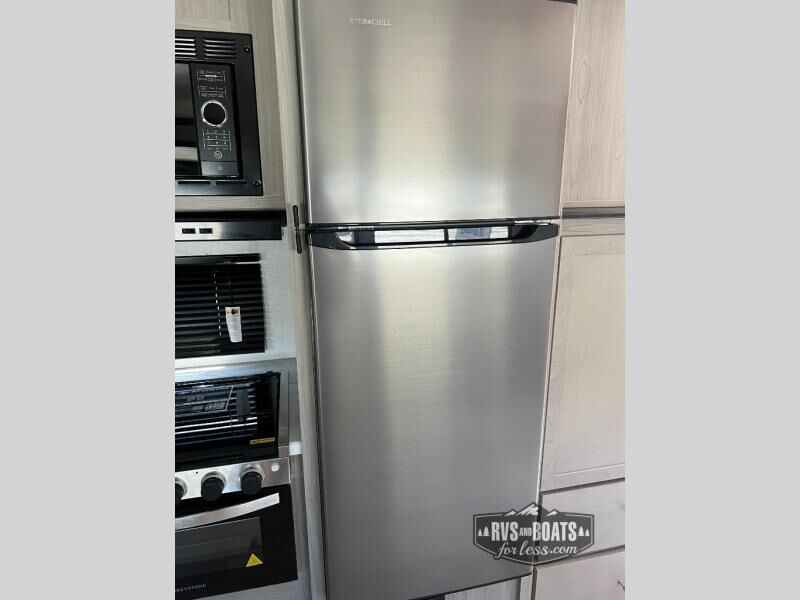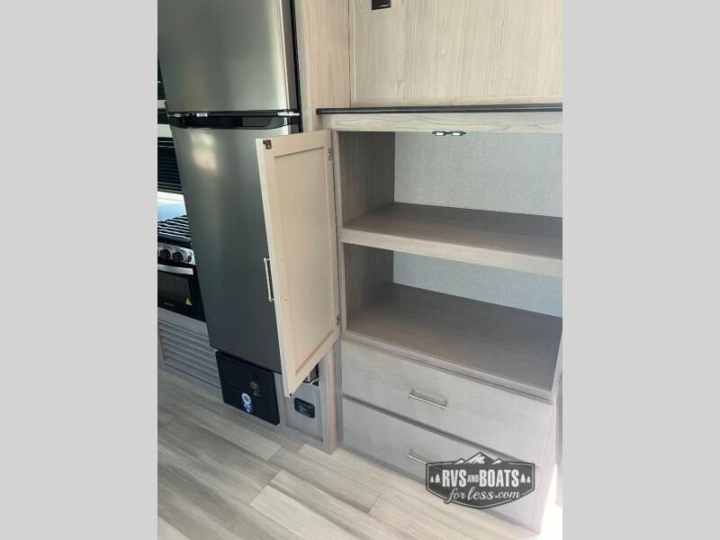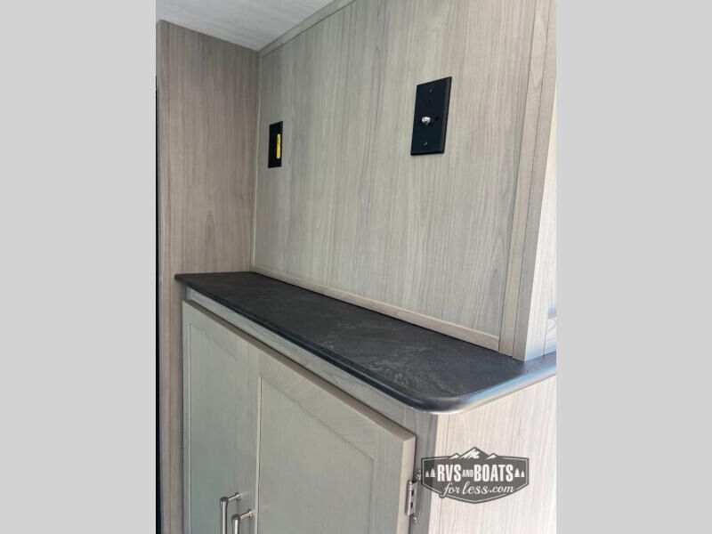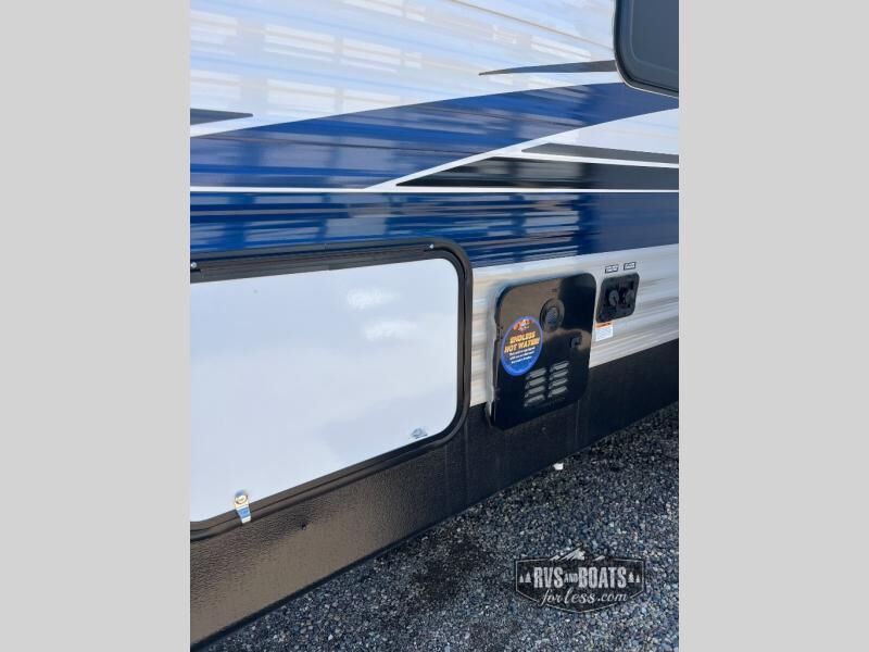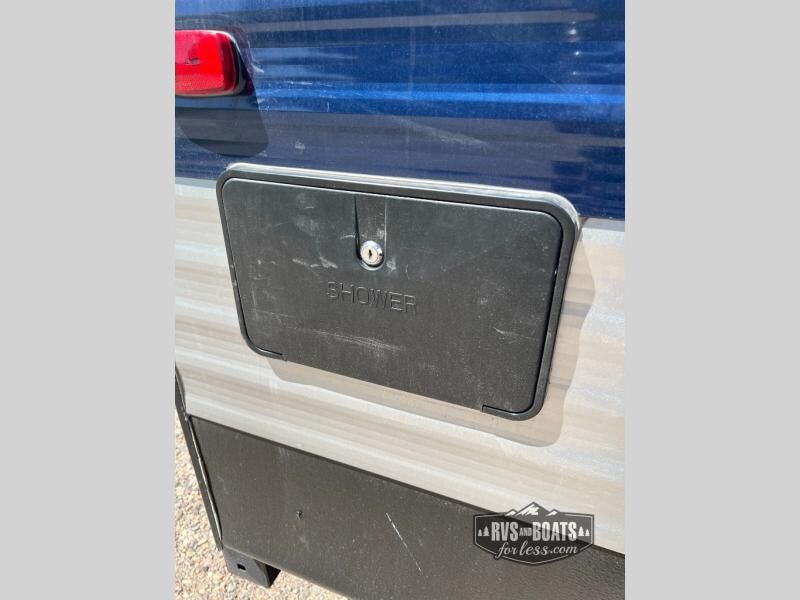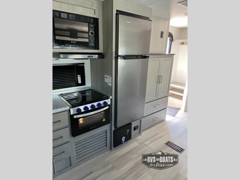 You will love the amount of space you have in this rear bath trailer! Once the super slide is put out, you can let the dog nap on the floor, relax on the jack knife sofa, or play a game at the booth dinette. The chef will will be able to cook meals on the three burner cooktop and store leftovers in the 12V refrigerator. A full rear bath with a 38" walk-in shower onboard lets you clean up each day, and the front private bedroom has a queen bed just like at home. There are also dual closets and dual nightstands for your things, and a convenient laundry chute. Head outdoors to enjoy the 16' awning plus outdoor griddle and refrigerator!
