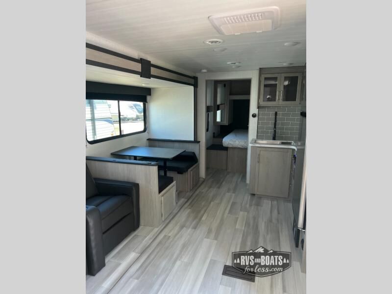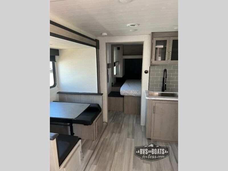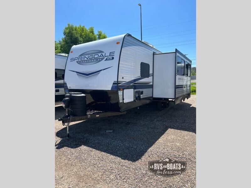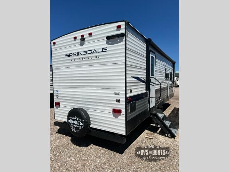 With any Springdale travel trailer by Keystone you will enjoy convenient amenities and comfortable camping features at every turn. The aluminum exterior will be easy to clean, and the power awning provides protection against the hot summer sun. There is also an exterior shower, a friction hinge entry door, and an XL entry assist handle to safely enter and exit the unit. You will find many comforts inside, including a stainless steel sink, ample storage space for your belongings, and cozy sleeping spaces. Start a new adventure today in a Springdale travel trailer!