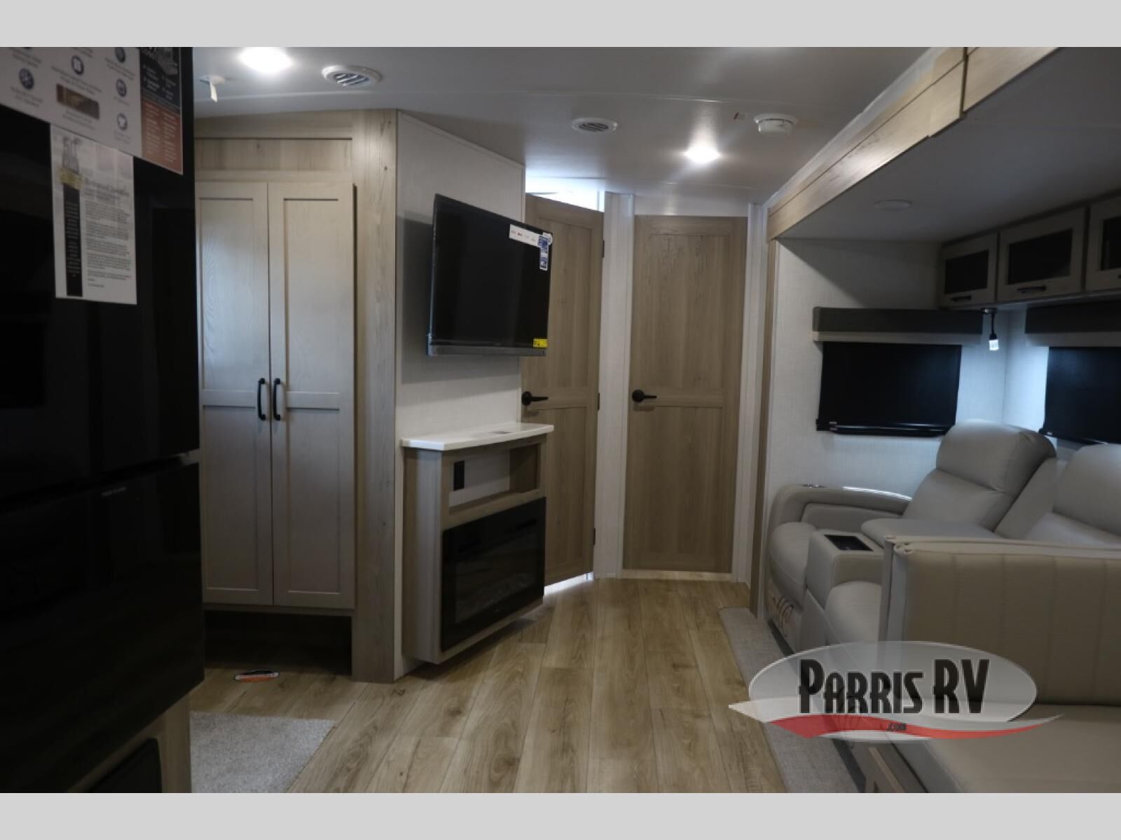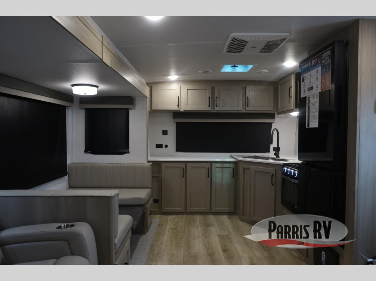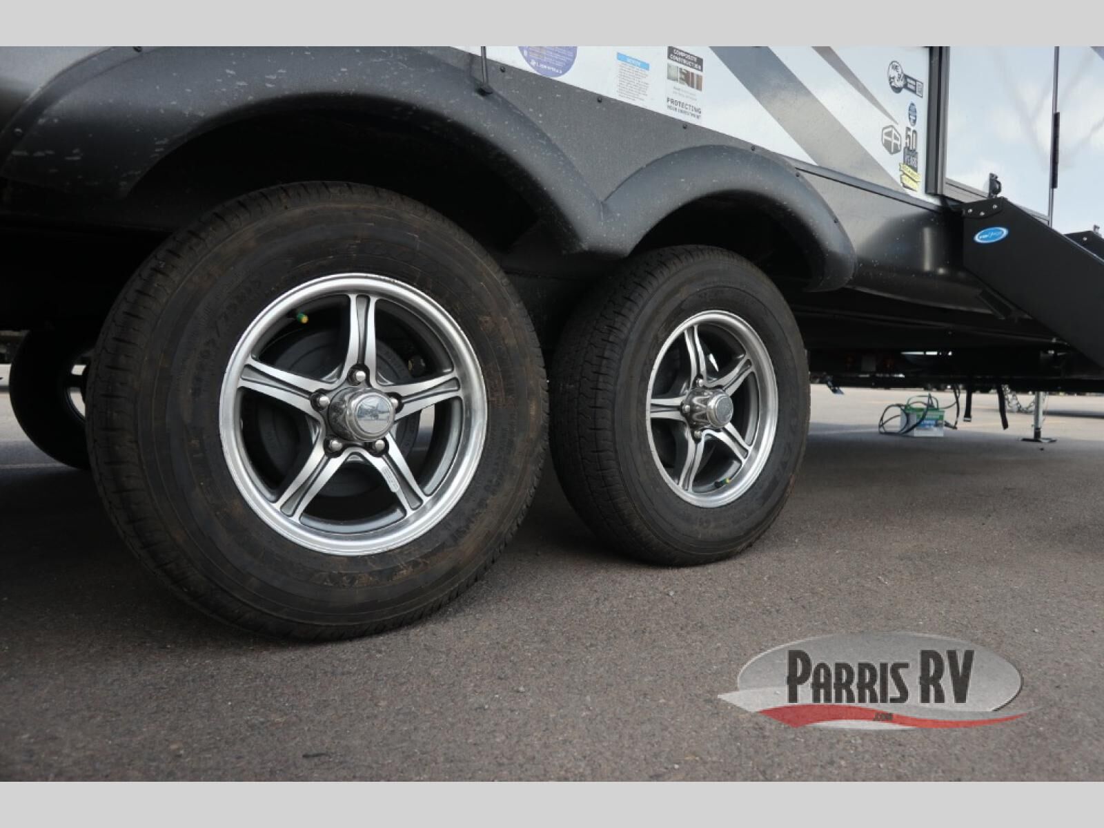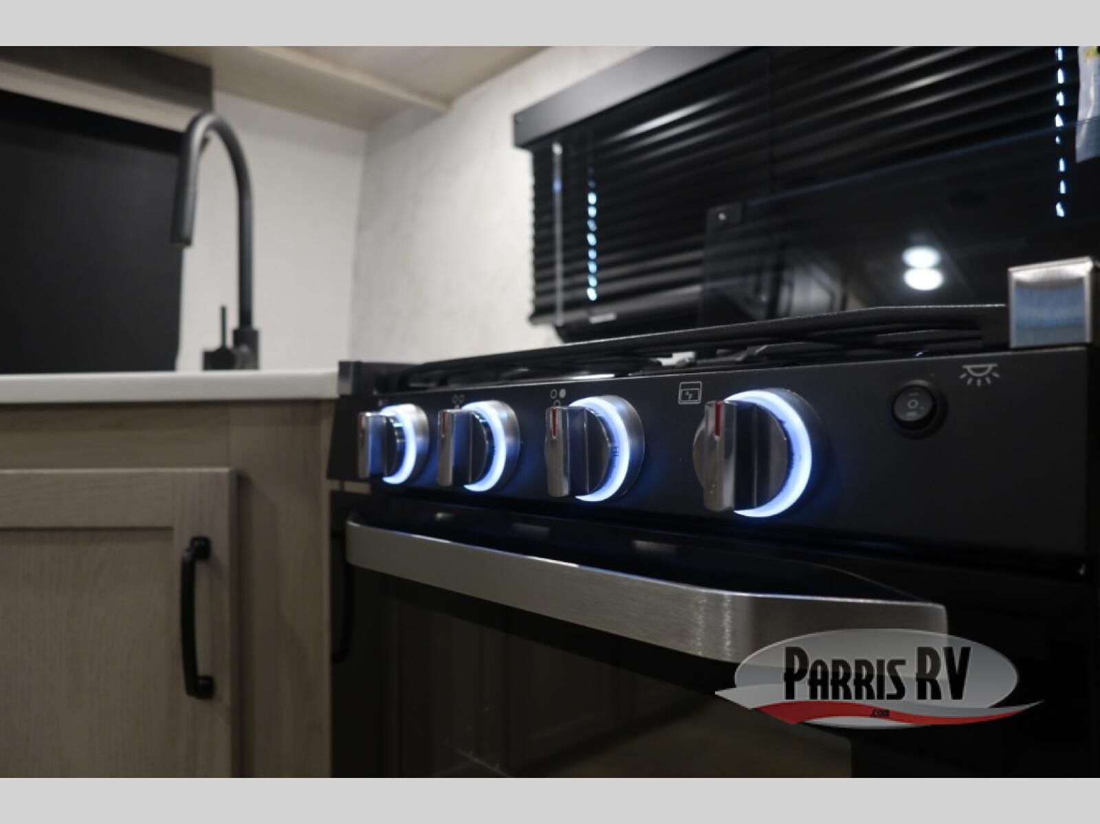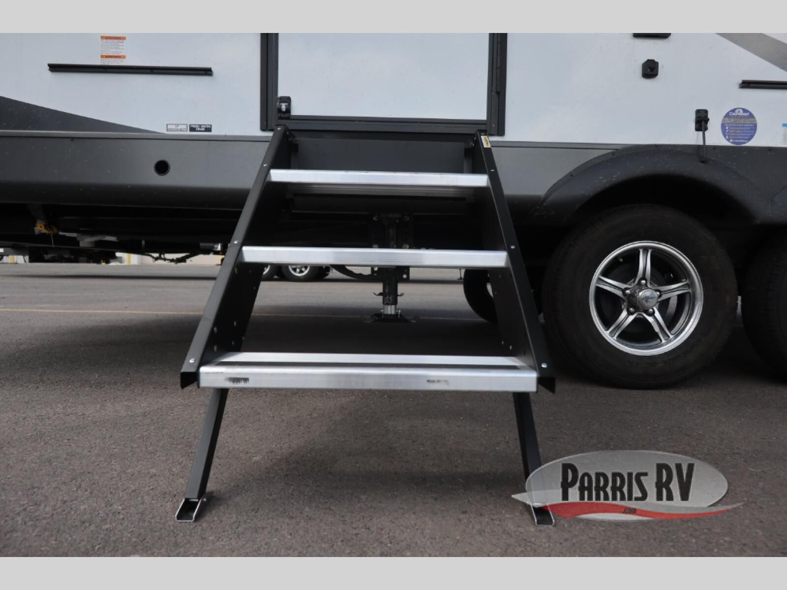 When you are outside this trailer you can enjoy the protection from the 21' power awning, and whip up a meal using the outside griddle. You will find exterior storage for your extra gear, and a ladder at the rear. You get to choose which entrance to step up into, be it the spacious rear bedroom with a queen bed slide and a wardrobe, or the main entry into the kitchen and living area. The furniture slide includes a booth dinette to eat your meals at, and theater seating to watch the Smart TV with a fireplace below. And the cook will love the front kitchen with extra counter space, a three burner range, plus a 12V refrigerator and pantry for food storage!