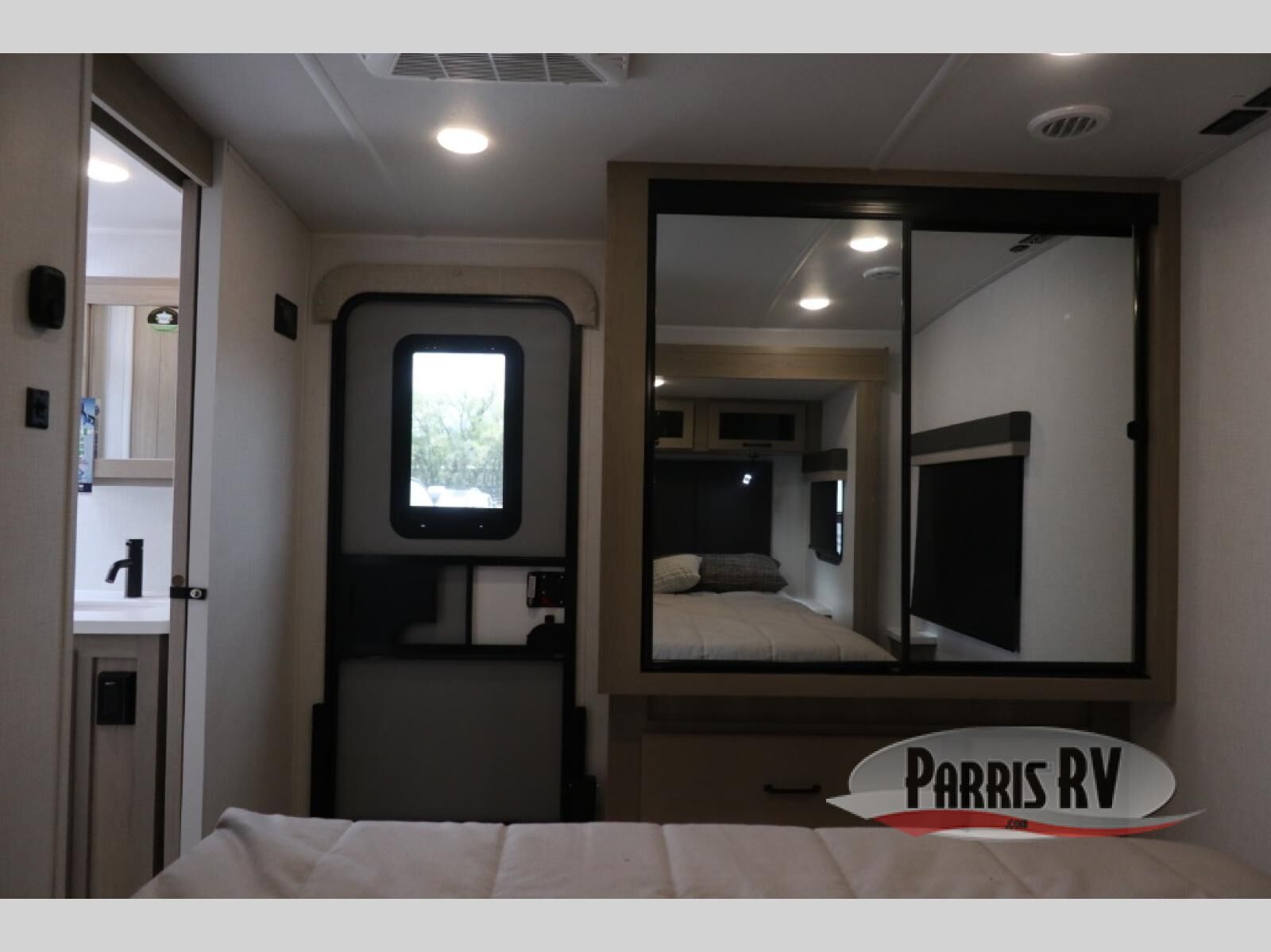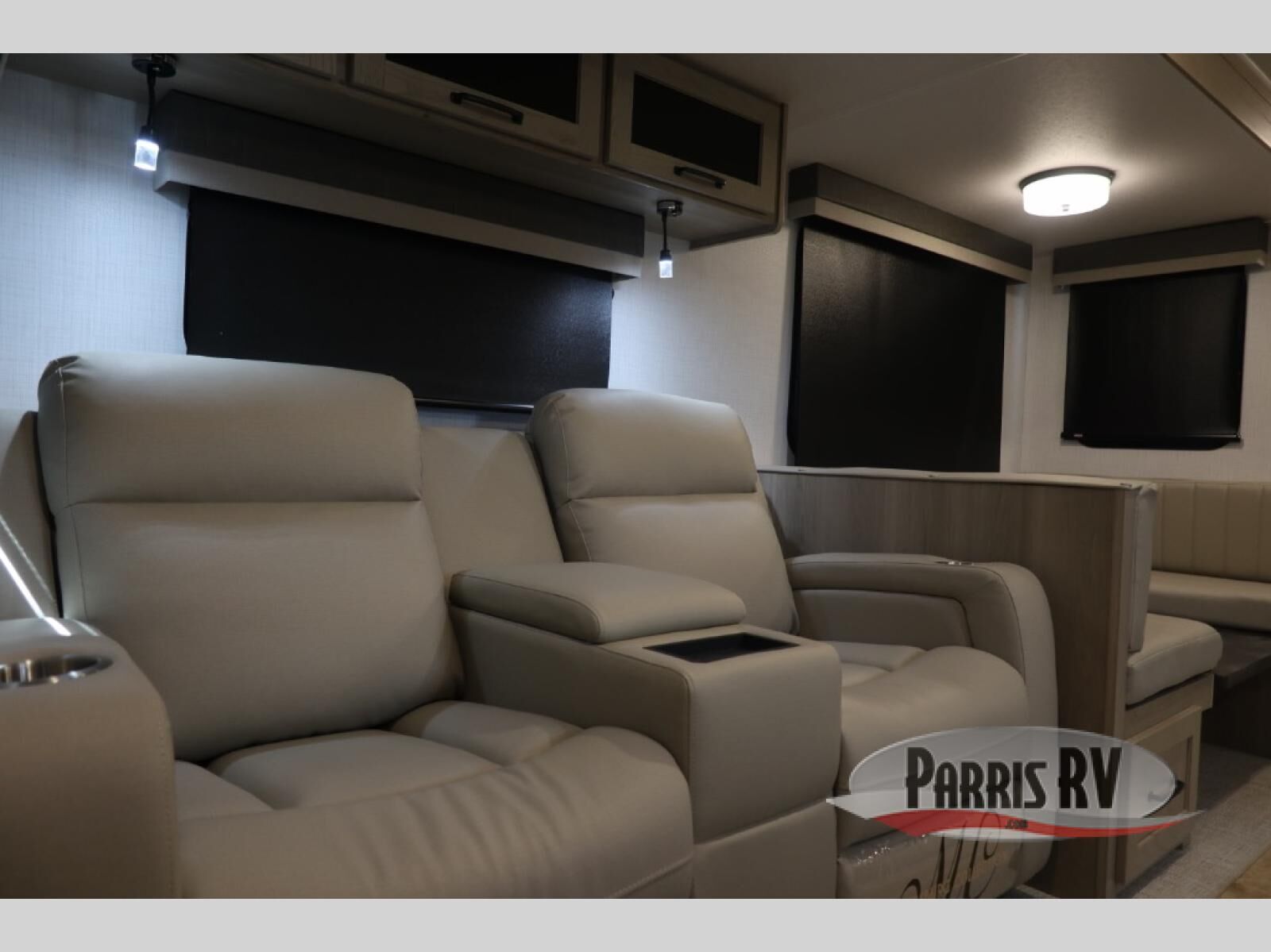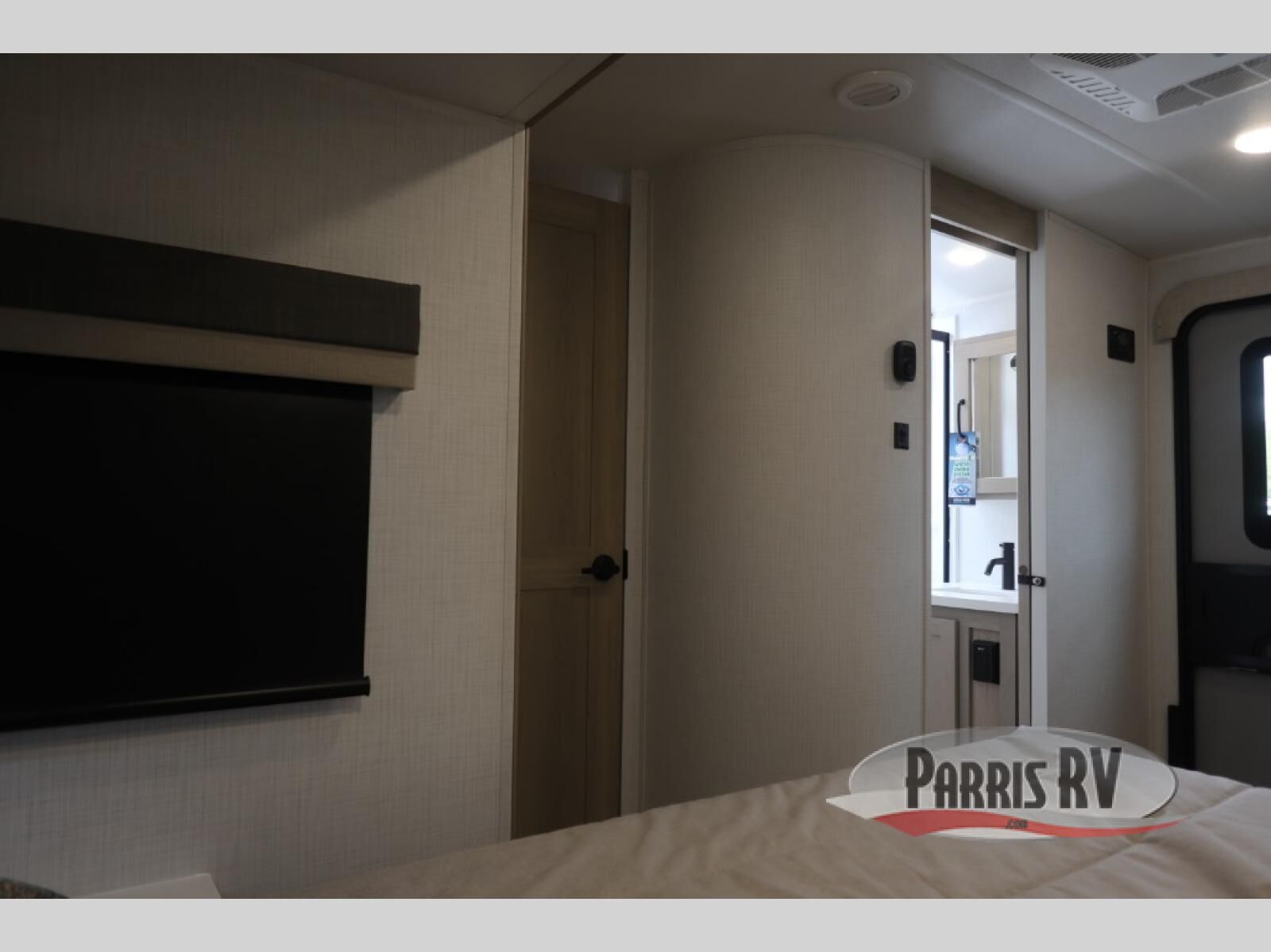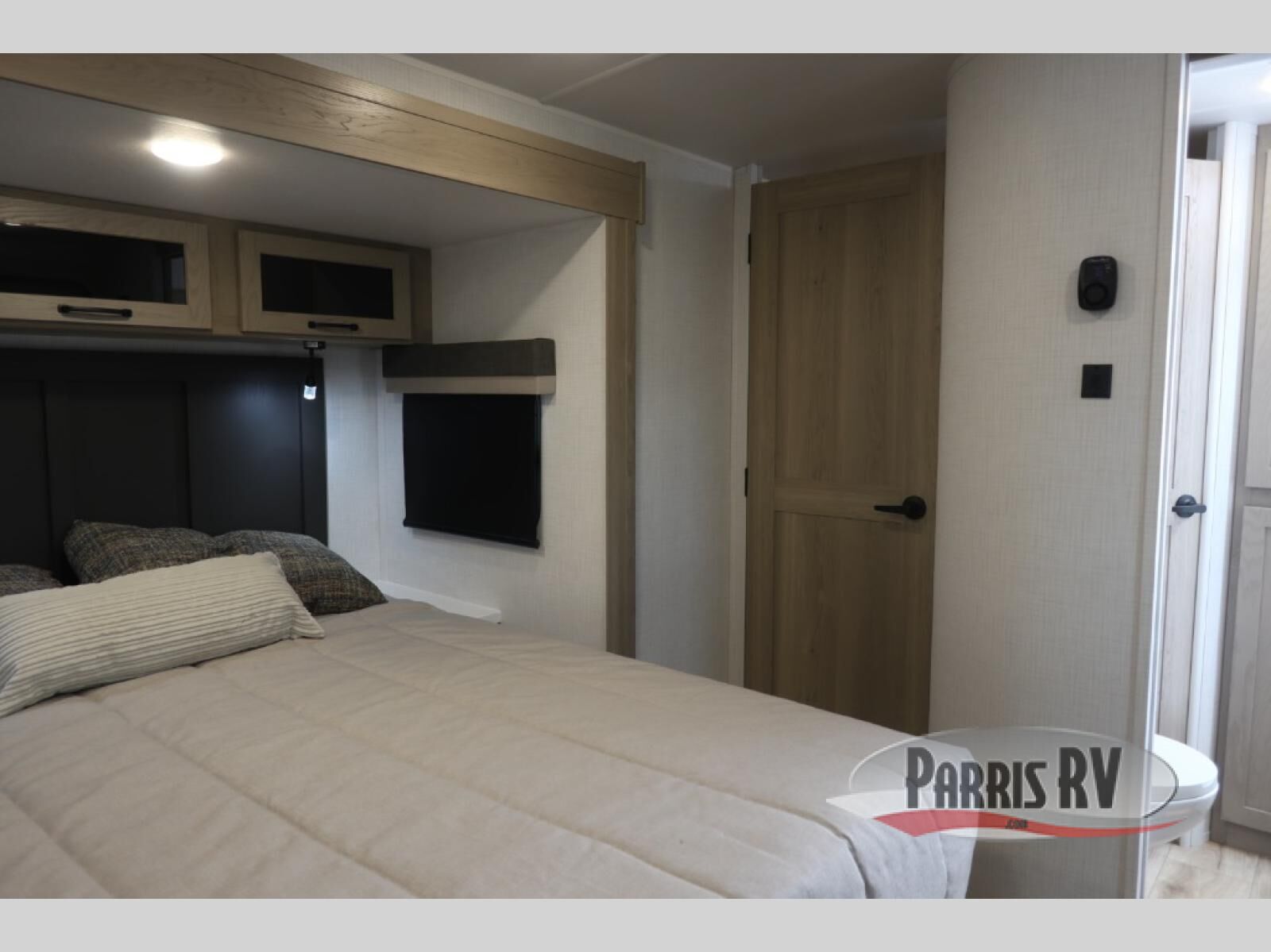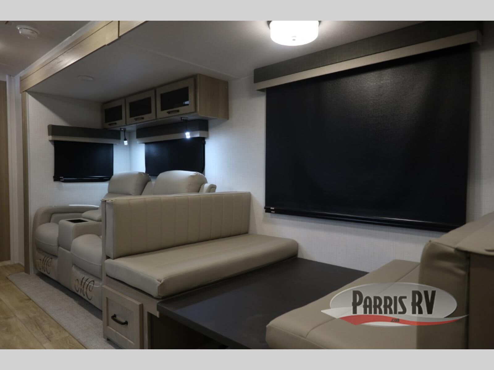 When you are outside this trailer you can enjoy the protection from the 21' power awning, and whip up a meal using the outside griddle. You will find exterior storage for your extra gear, and a ladder at the rear. You get to choose which entrance to step up into, be it the spacious rear bedroom with a queen bed slide and a wardrobe, or the main entry into the kitchen and living area. The furniture slide includes a booth dinette to eat your meals at, and theater seating to watch the Smart TV with a fireplace below. And the cook will love the front kitchen with extra counter space, a three burner range, plus a 12V refrigerator and pantry for food storage!