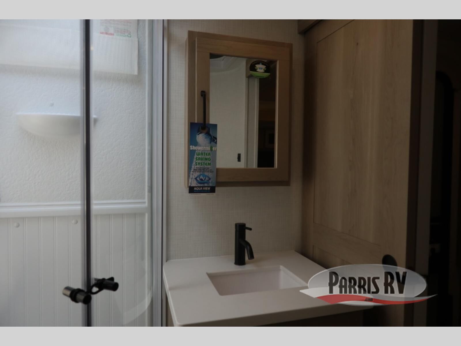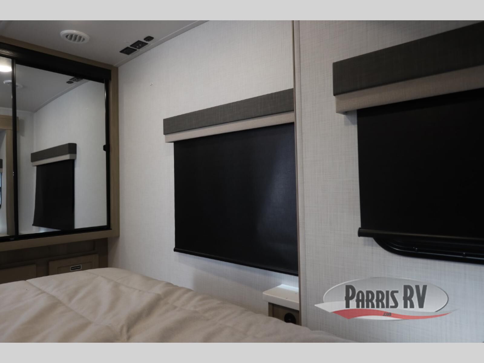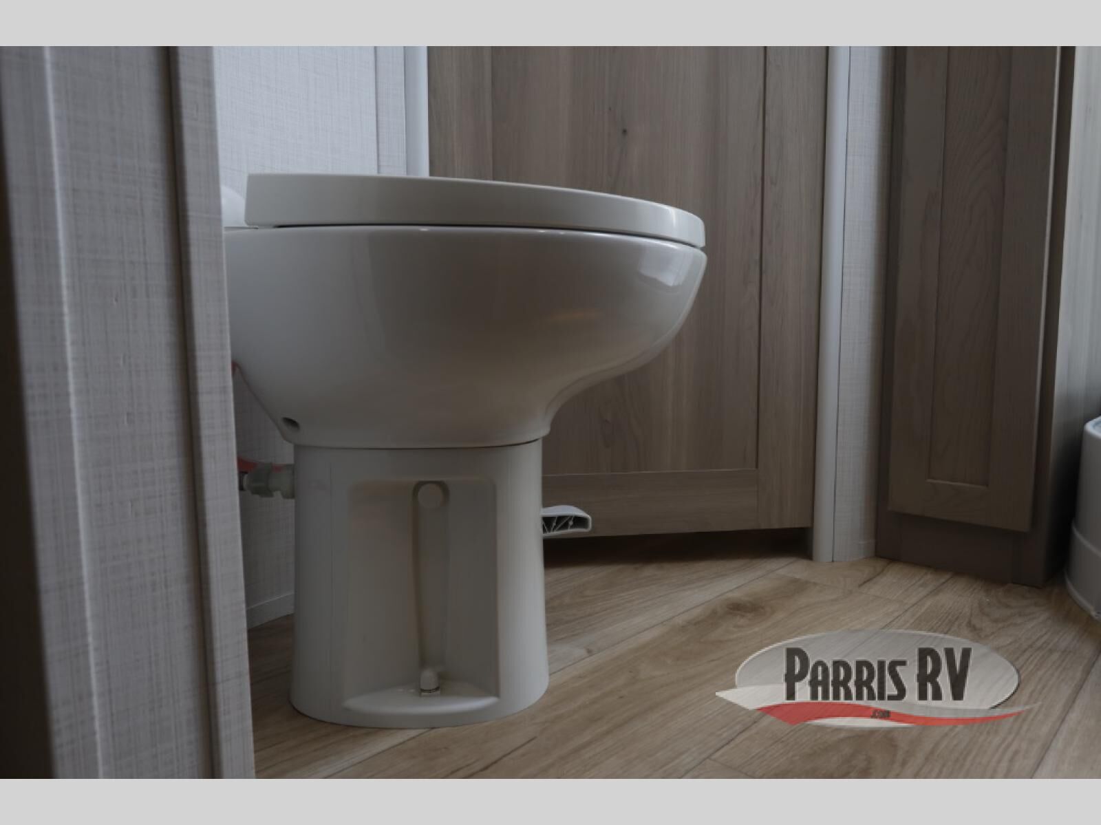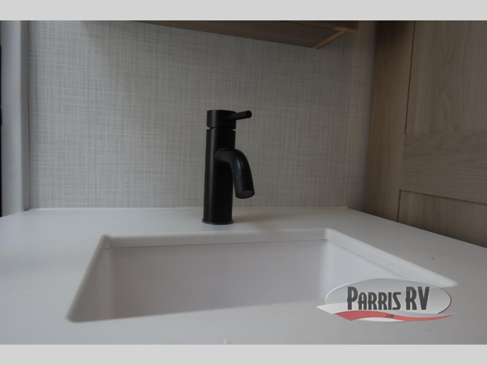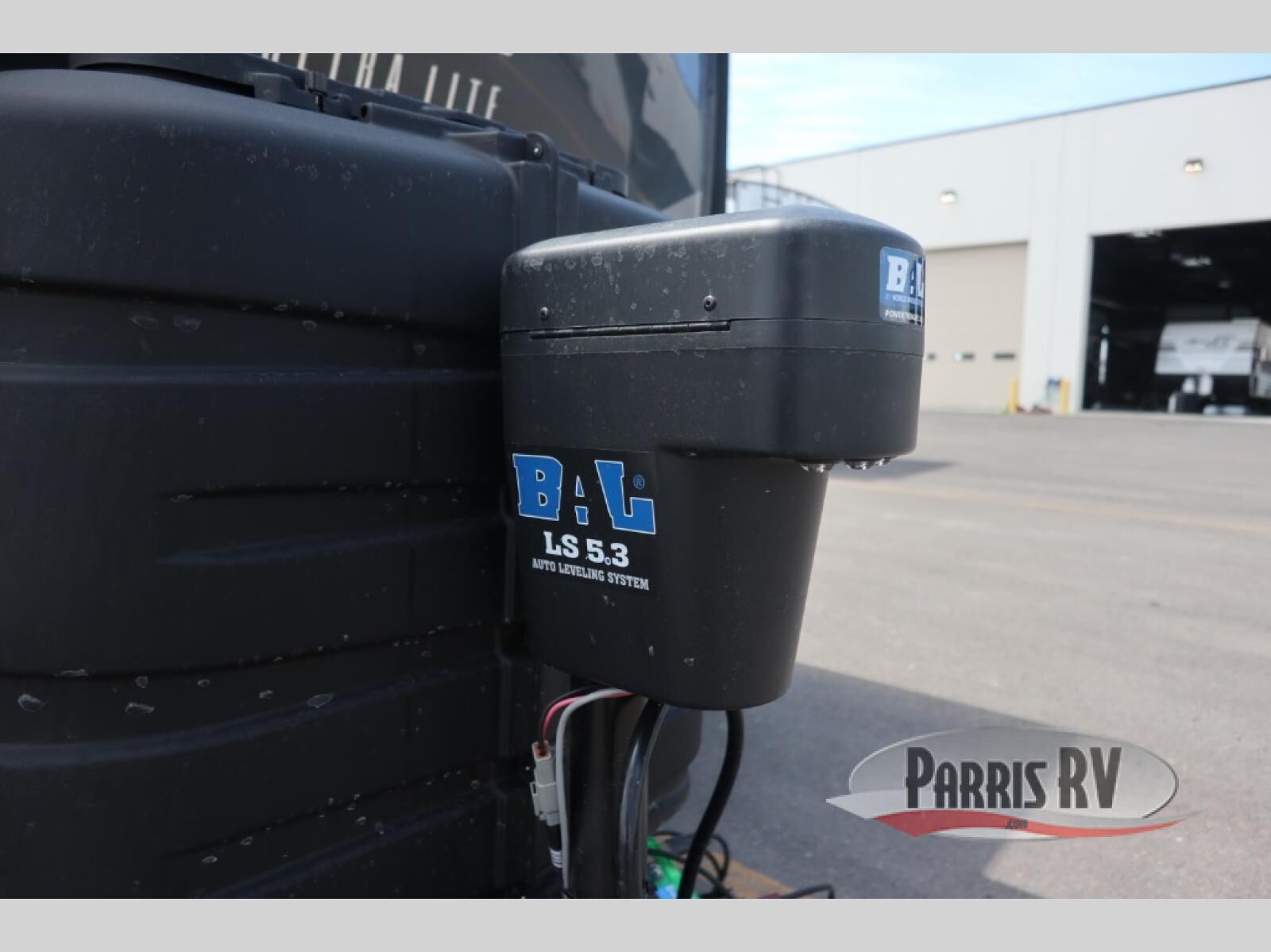 When you are outside this trailer you can enjoy the protection from the 21' power awning, and whip up a meal using the outside griddle. You will find exterior storage for your extra gear, and a ladder at the rear. You get to choose which entrance to step up into, be it the spacious rear bedroom with a queen bed slide and a wardrobe, or the main entry into the kitchen and living area. The furniture slide includes a booth dinette to eat your meals at, and theater seating to watch the Smart TV with a fireplace below. And the cook will love the front kitchen with extra counter space, a three burner range, plus a 12V refrigerator and pantry for food storage!