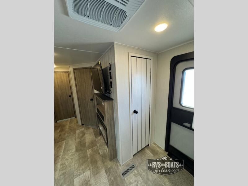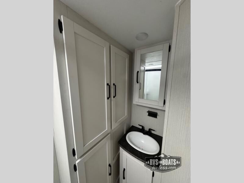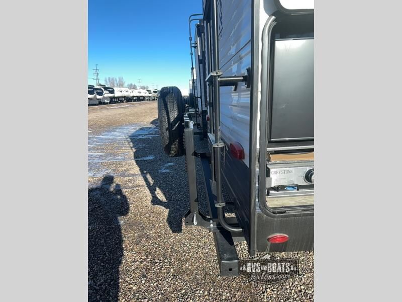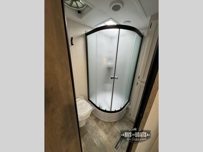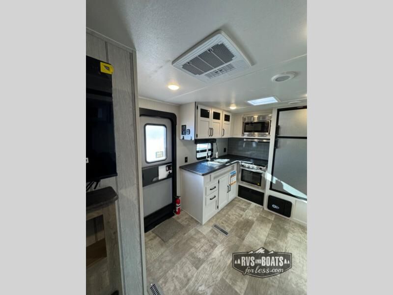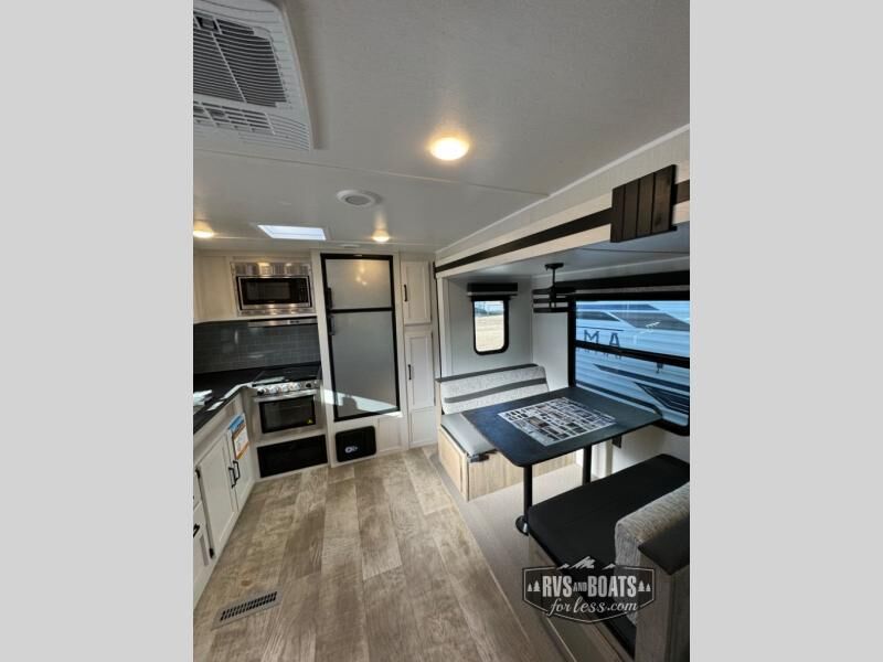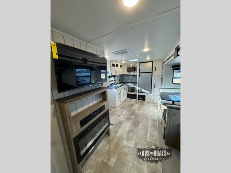 The chef will love cooking in the rear kitchen of this travel trailer! The booth dinette offers a comfortable place to dine, play, and even sleep. Take an afternoon nap on the sofa and watch your favorite movies at night with the entertainment center, and you may want to add the optional fireplace here to make it feel more like home. Start your mornings off feeling fresh by showering in the full bathroom with the 34" x 34" radius shower after getting a good night's rest on the queen bed in the front private bedroom! You can also add the optional outside kitchen if you like more time outdoors!