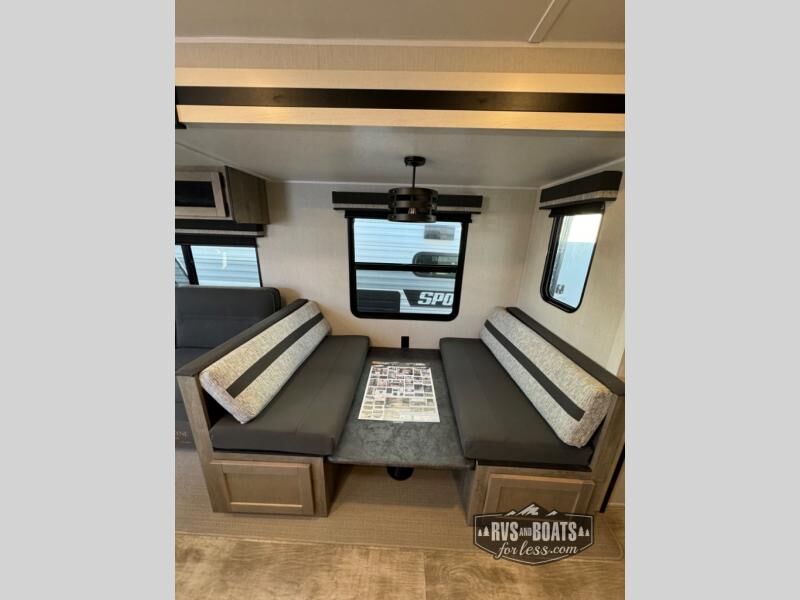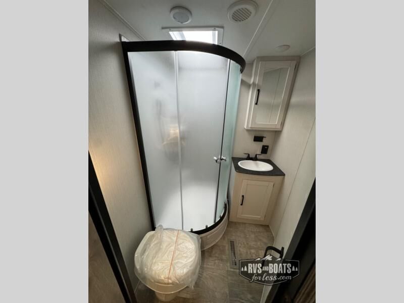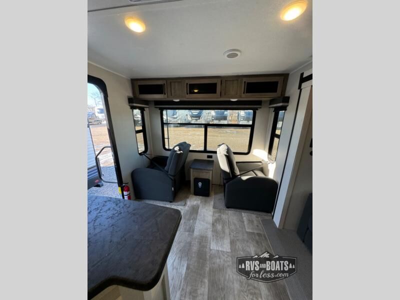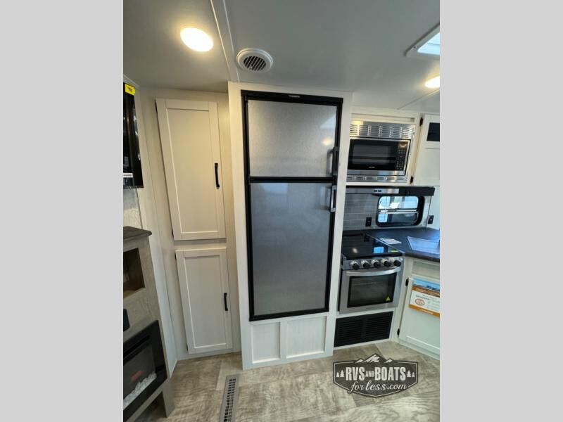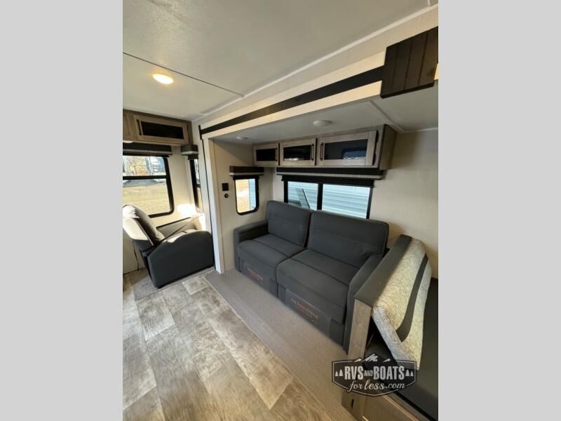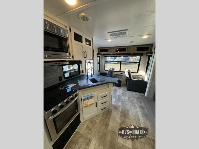 Comfort and convenience is found throughout this travel trailer! The set of rear recliners have an end table in between to set your cup of coffee as you read the newspaper, and the sofa is a great place to take an afternoon nap. After you have prepared your best home cooked meal with the three burner cooktop and 11 cu. ft. stainless steel refrigerator, you can head to the booth dinette then play a card game or two. The full bathroom has a 34" x 34" radius shower to freshen up in before heading to the front private bedroom to enjoy a good night's rest on the queen bed which has shirt closets and nightstands on either side of it.