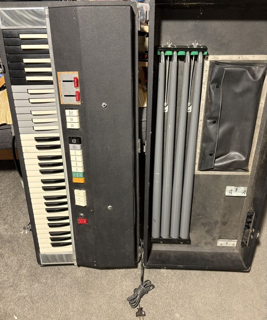 Super cool and rare combo organ made by RHEEM. John Cale of the Velvet Underground was known to play one of these. This one has the lid and original stowaway legs. This one is 90% working. All keys work but may need some TLC to bring back to full glory.