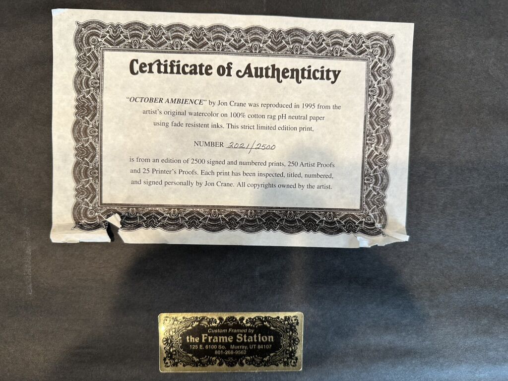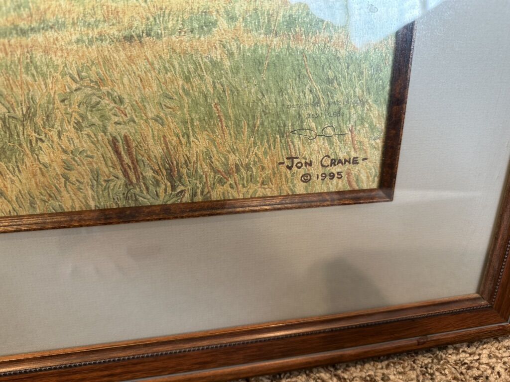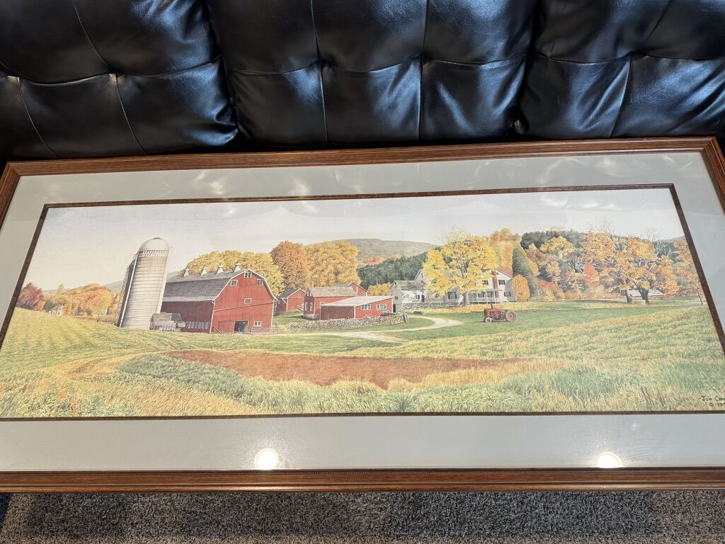 VenmoBeautiful and colorful limited edition (2021/2500) print by well-known South Dakota artist Jon Crane. It purports to be a scene at “Fern Hill Farm near Wallingford, Vermont where the artist spent his summers as a kid.” This framed print (with frame) is appx. 60 1/2” wide and 27” high. The print itself is appx. 51” x 18”. It comes with a Certificate of Authenticity.