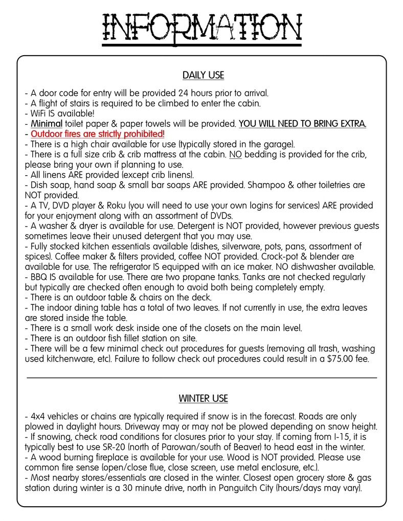 Cabin is 55 minutes from beautiful Bryce Canyon National Park, 30 minutes from Cedar Breaks National Monument, 35 minutes from Brian Head Ski Resort, plenty of OHV Trails, wildlife viewing. 1/2 mile to Panguitch lake with world class fishing and ice fishing. Boat rentals are available at the resort. A couple of restaurants are available around the lake in the summer time including the “Burger Barn”.