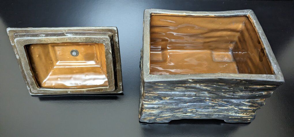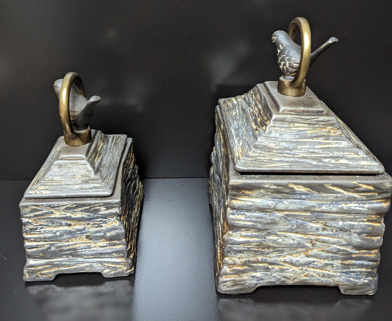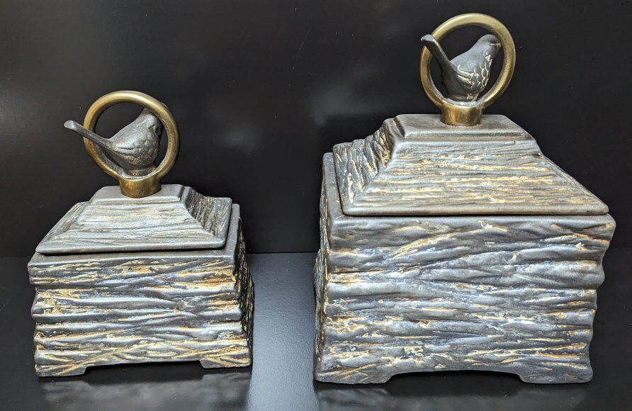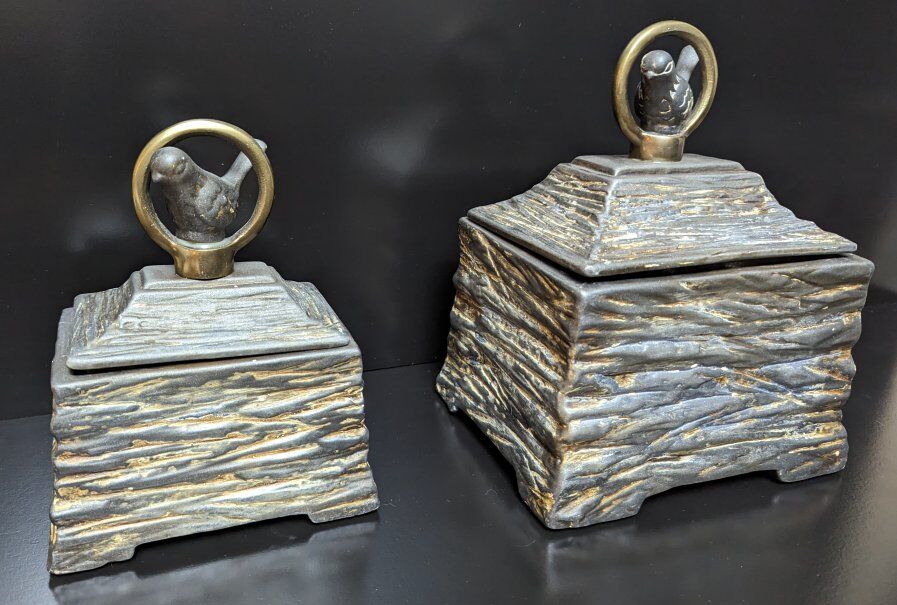 Uttermost Birdie Boxes Vintage ceramic metallic boxes with a birdie handle and accents. Finished with a glossy and smooth gray, green, black, gold, and bronze metallic. It's a rare find for any room, suitable for storing jewelry, letters, or tea. Removable Lids. Sizes: Sm-6x8x4, Lg-8x10x6