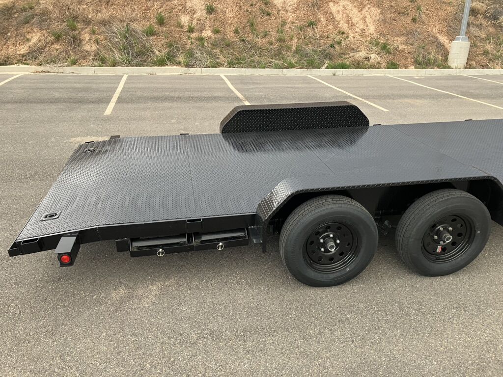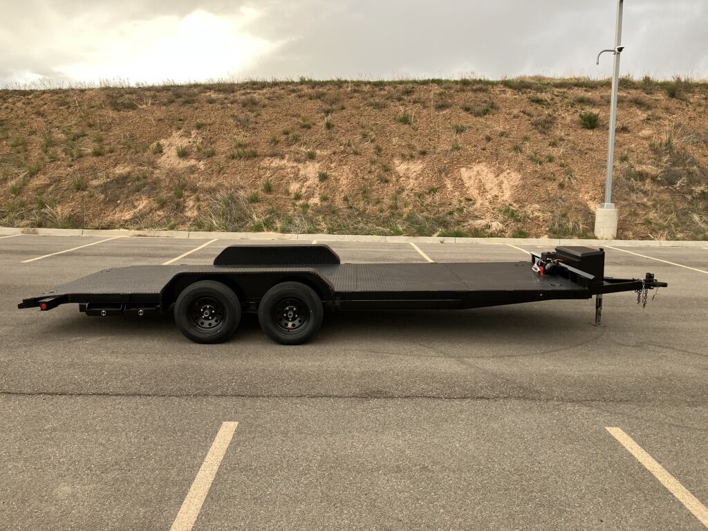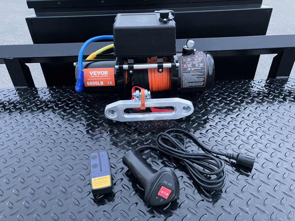 Features: -6,000 lb electric winch, with 2-remotes (Wireless & Plug-In) -4 In-Deck/Recessed Tie Down D-Rings -Low Profile Drive Over Fenders -2-5/16” Hitch -Spare Tire -Breakaway Battery Brake Box