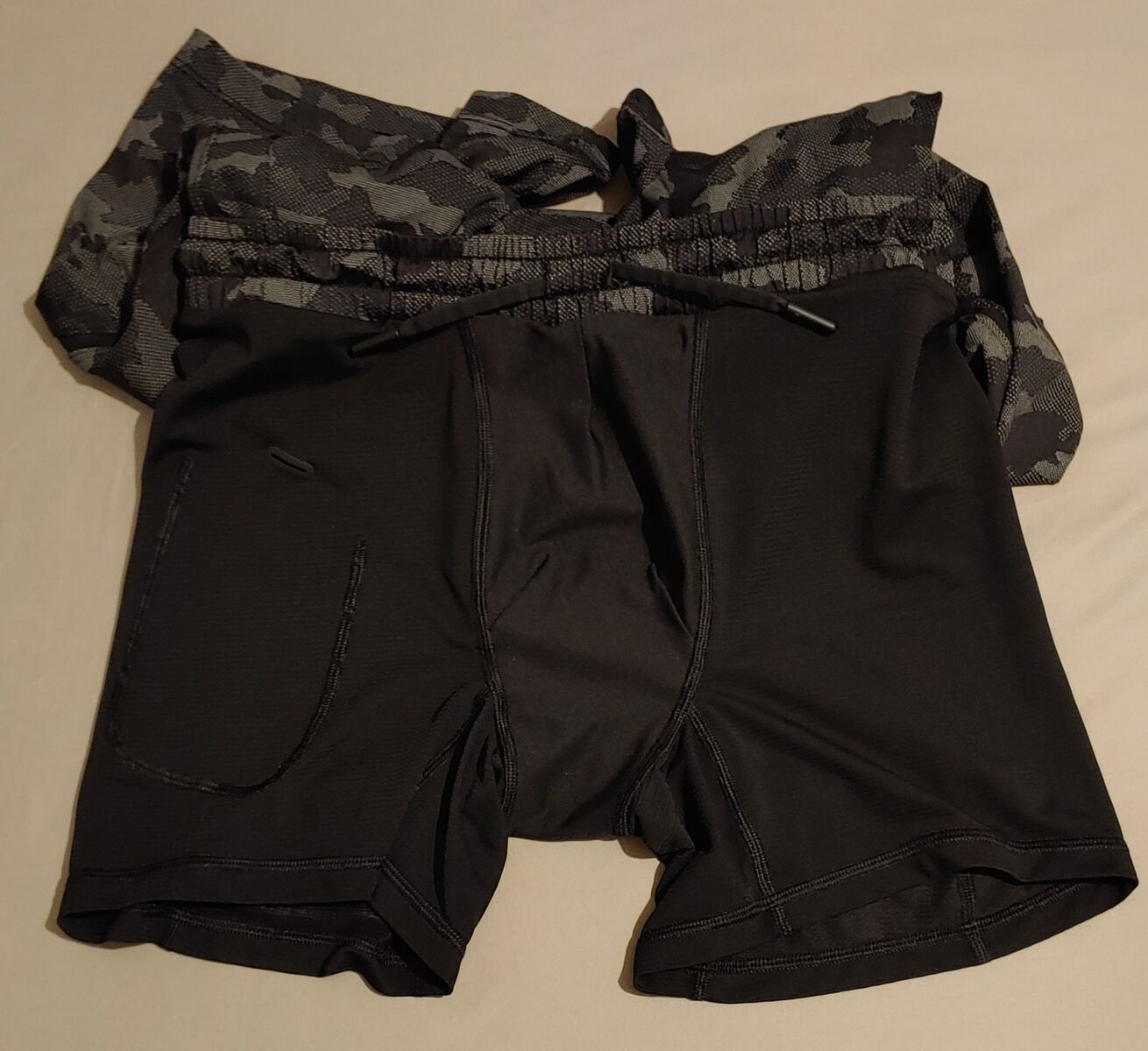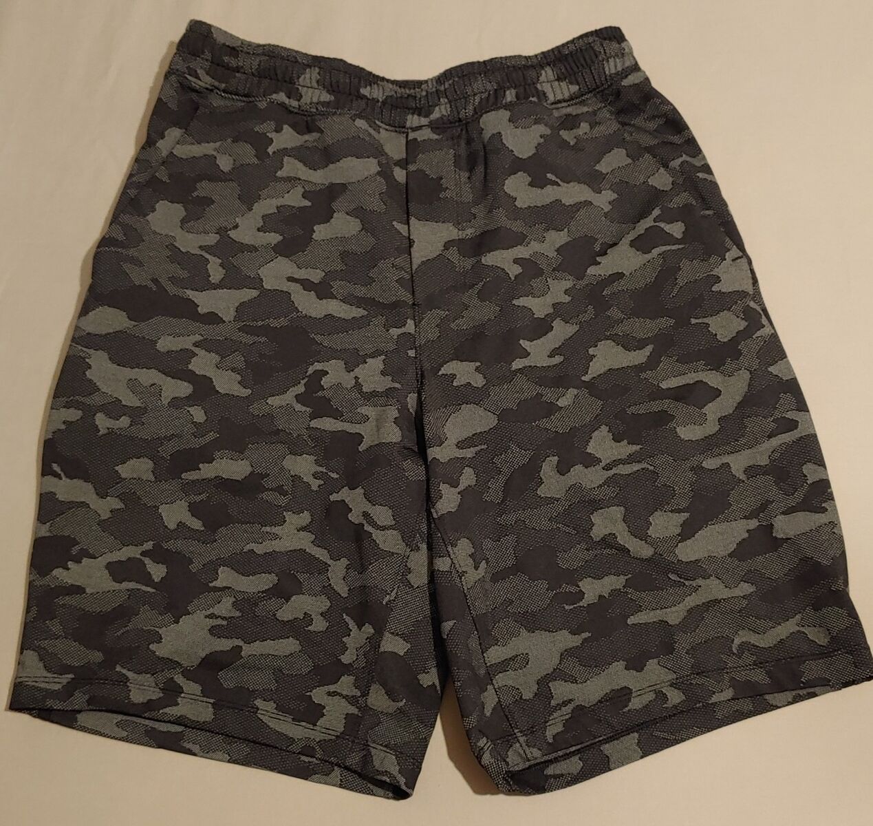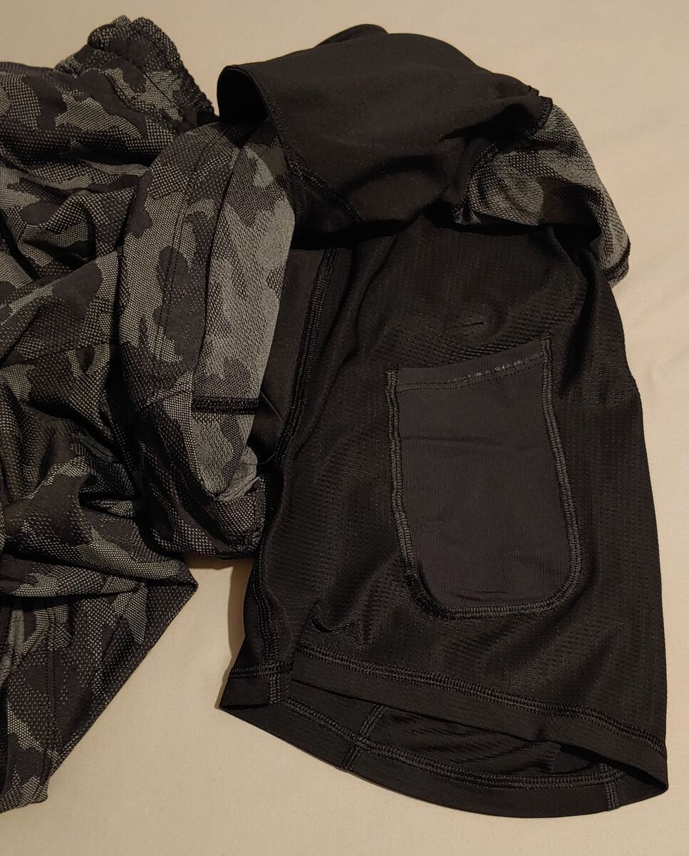 Men's Lululemon Pace Breaker athletic/athleisure shorts, lined with a 9" inseam, slant front pockets along with a secure zippered pocket that is sure to be useful. The liner has a media pocket to keep your device secure and is also great for the colder days ahead. Versatile for active and rest days. Made with a high-quality durable stretch fabric that's sweat wicking and fast drying that won't slow you down. It is not the thin fabric that is currently in stores. In a classic black and gray camouflage artwork print that's engineered into the fabric and will never go out of style. Retailed $78 new. Camo print is no longer available in stores. In excellent condition.