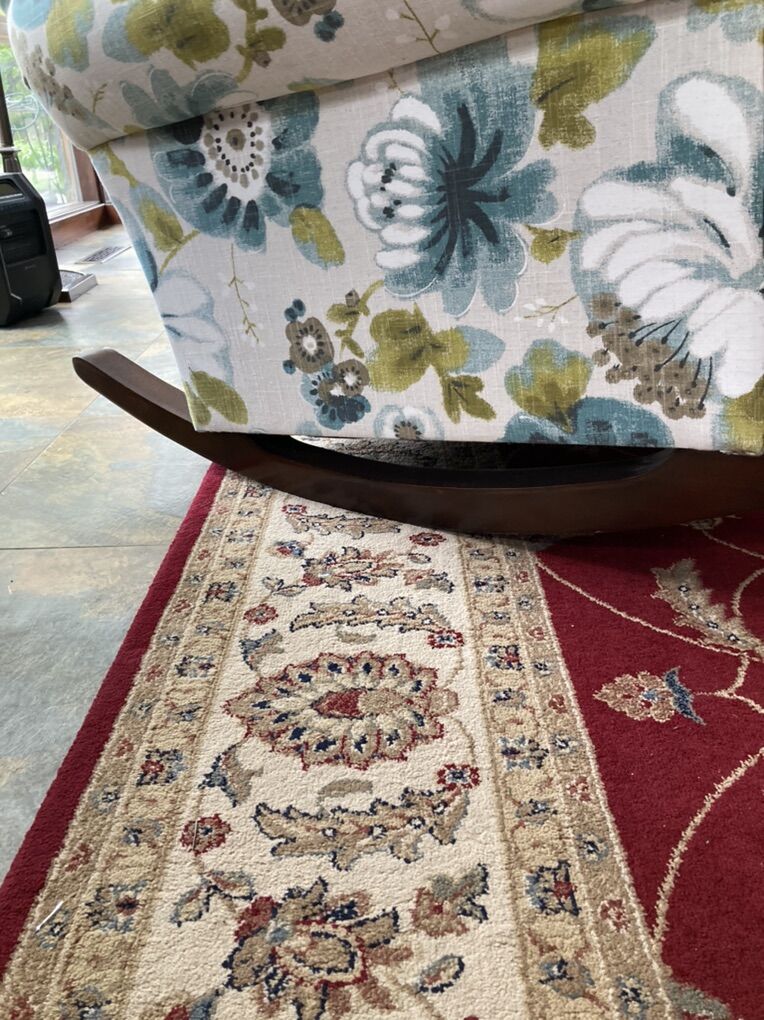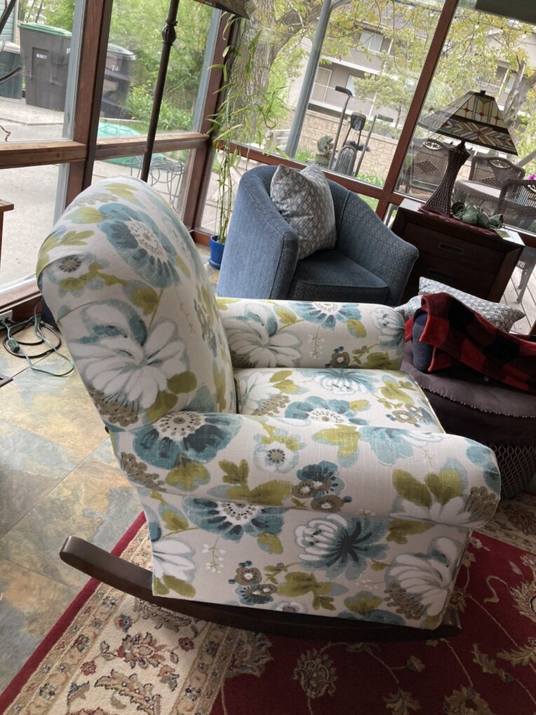 Lovely quality floral (blue tones) upholstered rocker. Made by England furniture company. Excellent condition -like new.Over $1,200 original list price. Selling for $650. Lowered to $450. Cash only. Near BYU -Provo.