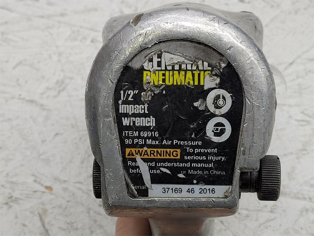 This 1/2-inch pneumatic impact wrench is designed for heavy-duty applications, providing reliable performance with a maximum air pressure of 90 PSI. The tool features a durable metal construction, ensuring longevity and resilience in demanding environments. Its ergonomic grip allows for comfortable handling during extended use. Ideal for automotive repairs, construction, and various mechanical tasks, this impact wrench is a valuable addition to any toolkit. The item is marked with the model number and specifications for easy reference.