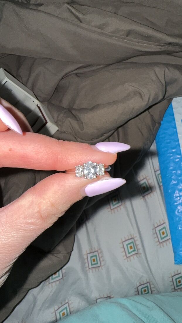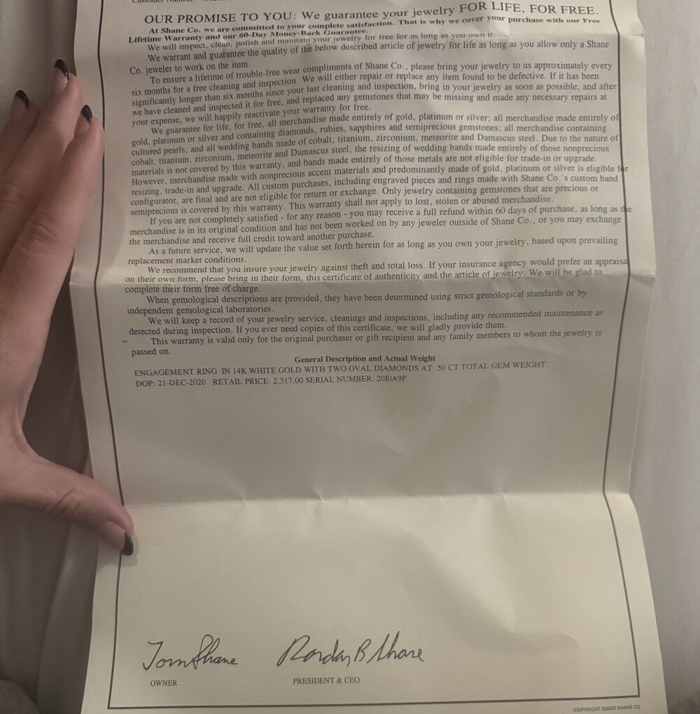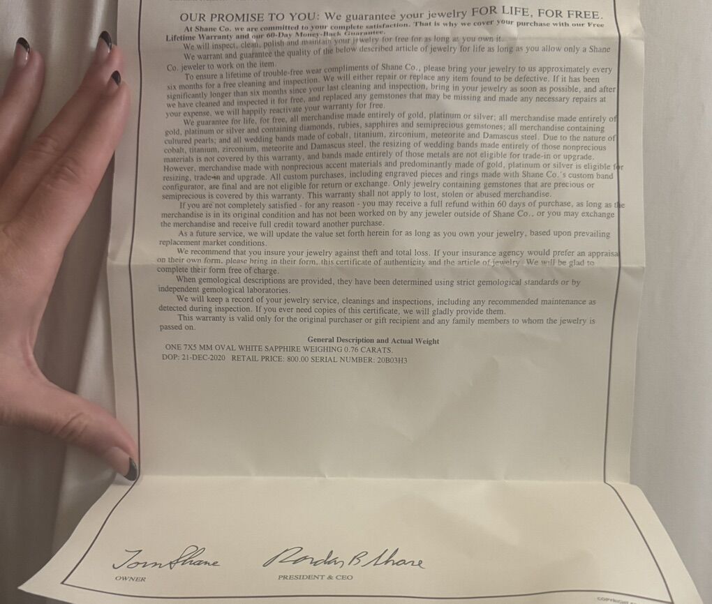 Venmo14k white gold with two oval diamonds at .50 total. One 7X5mm oval white sapphire 0.76 carrats. Ring size is 6.25. Ring is priced for a little over $3000, I’d like to get as close to listing price as possible but still open to offers. Paperwork is in photos, let me know if you have any other questions.