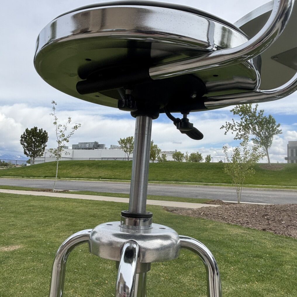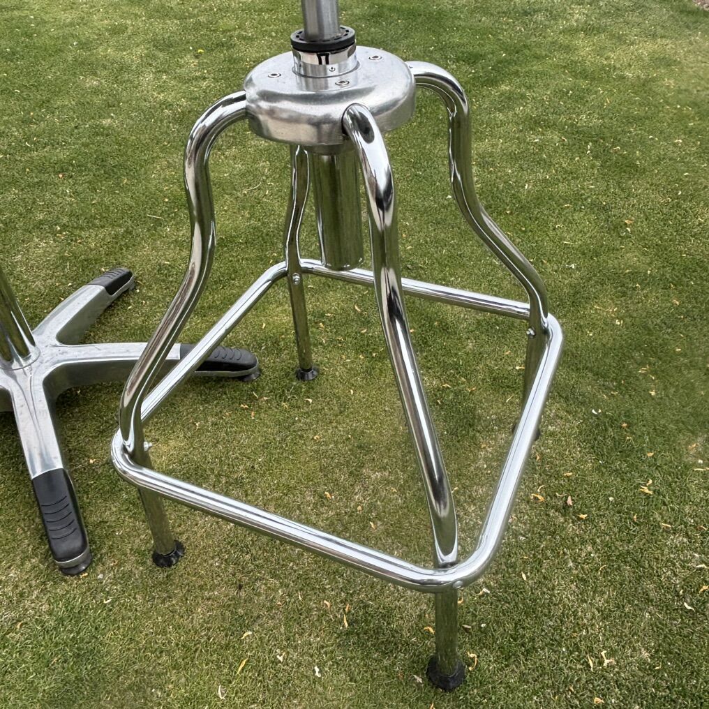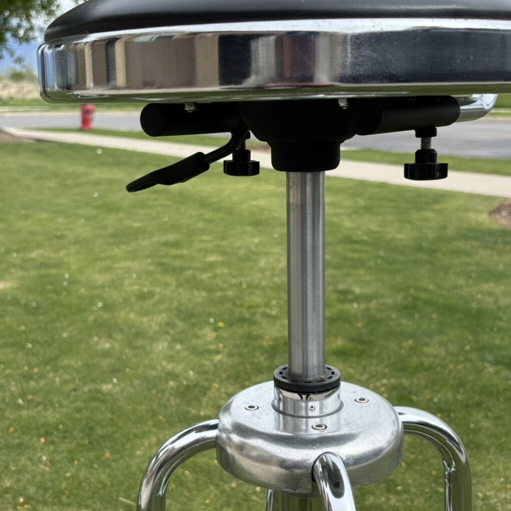 Hard to find wrench back pub set. Table and bar stools are in good working order. Tabletop has some fine scratches on table surface shown in photos. Table and chairs appear to have a small amount of paint splatter (I have not made any attempts to clean off) shown in photos. Chairs swivel and adjust up and down. Please see photos for overall condition. Measurement specs below.
