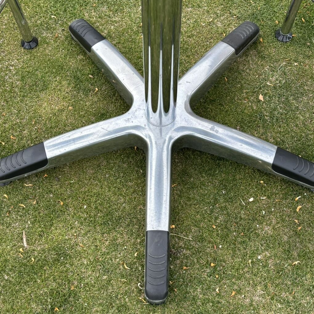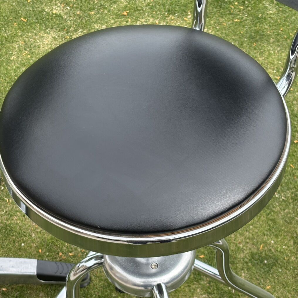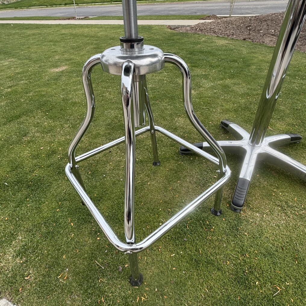 Hard to find wrench back pub set. Table and bar stools are in good working order. Tabletop has some fine scratches on table surface shown in photos. Table and chairs appear to have a small amount of paint splatter (I have not made any attempts to clean off) shown in photos. Chairs swivel and adjust up and down. Please see photos for overall condition. Measurement specs below.