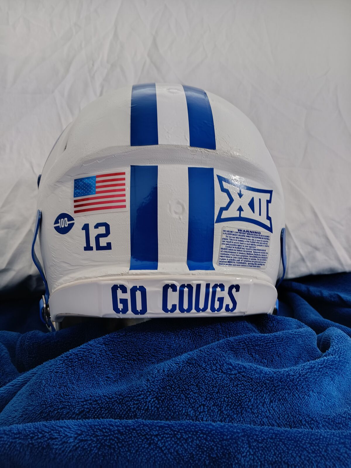Super awesome coustom byu helmet, great for display or cool memorabilia. Paint job is rough but but otherwise looks great. It's going for cheaper than normal coustom helmets which usally go for around 500-700 so message me if interested.