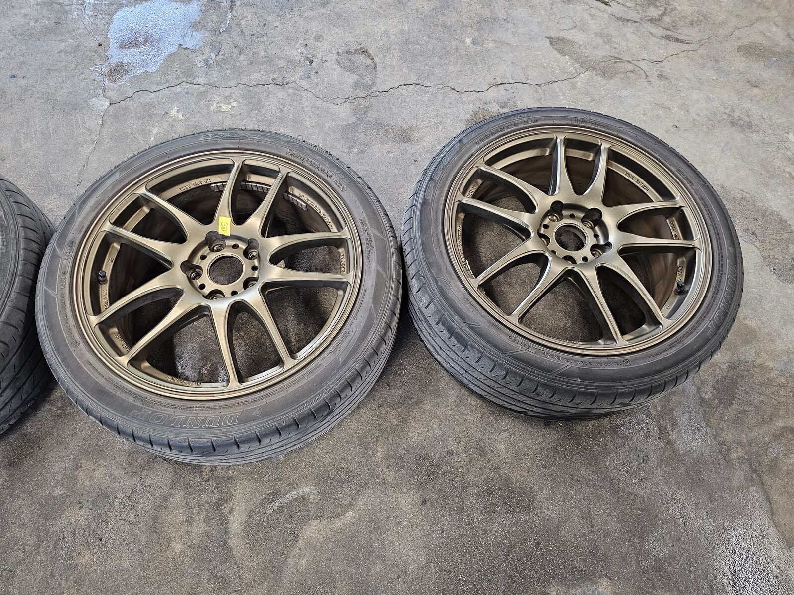 PayPalHere are a set of Work Emotion Kiwami 18x7.5 (114.3 spacing, 67.1mm bore, +47 offset) wheels in bronze. These wheels were made in Japan and came off a JDM car that was recently imported.