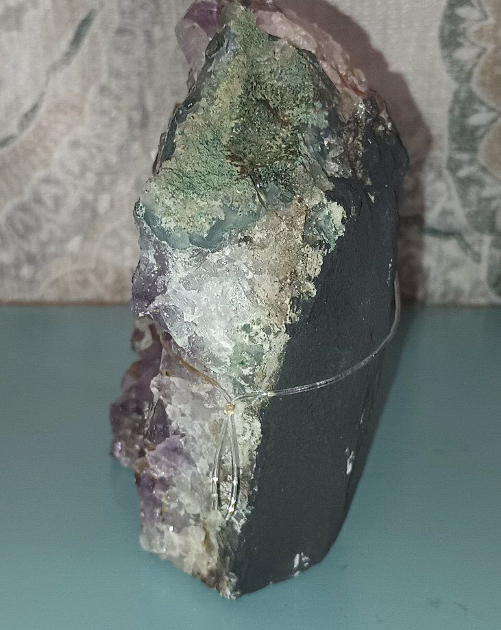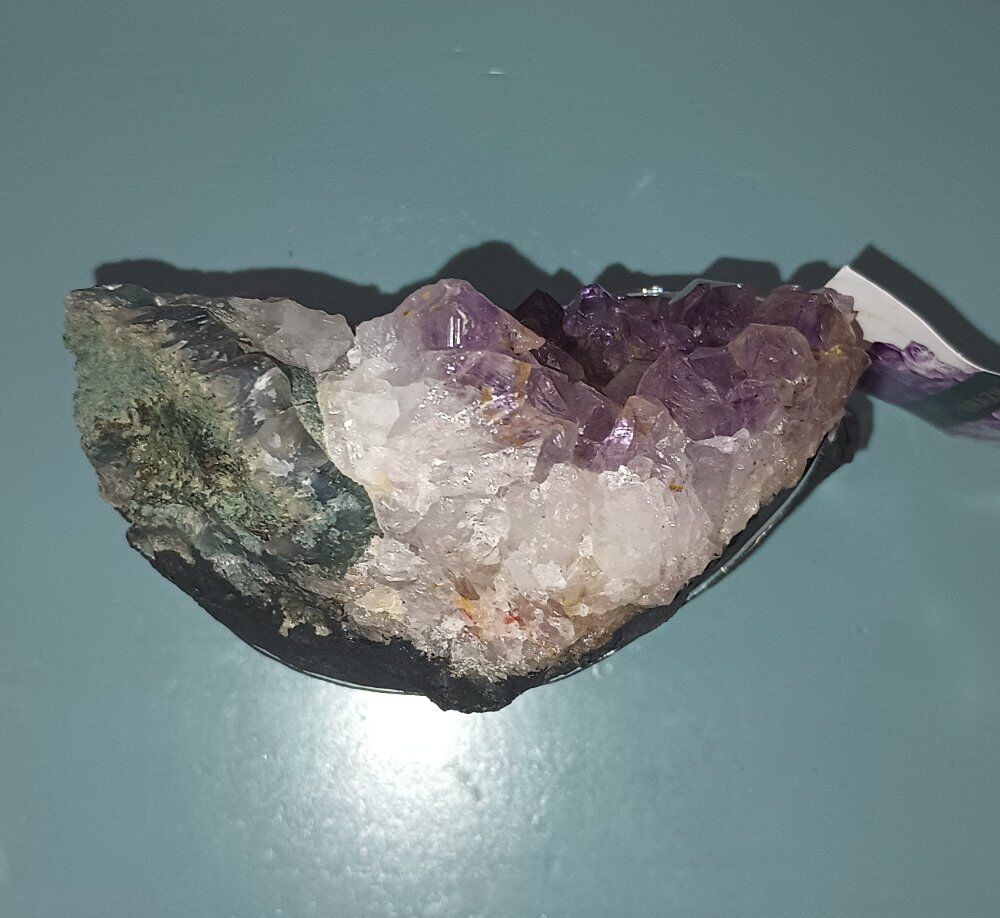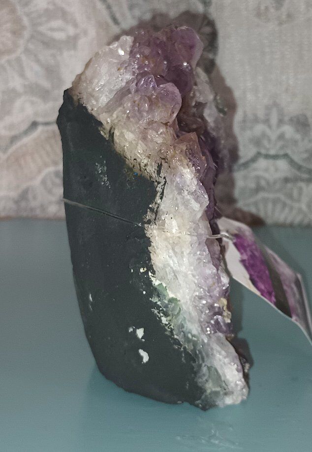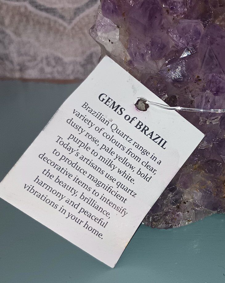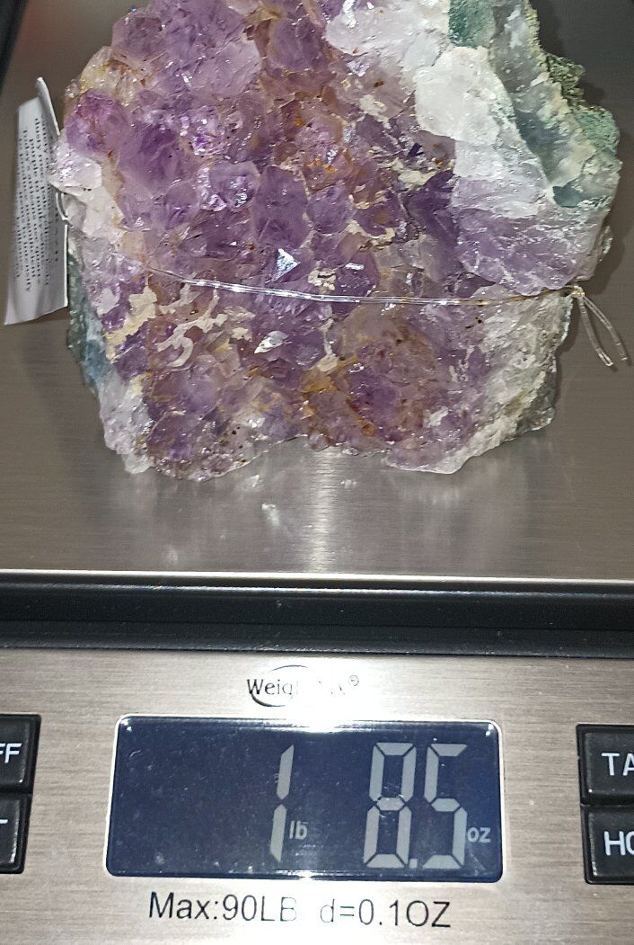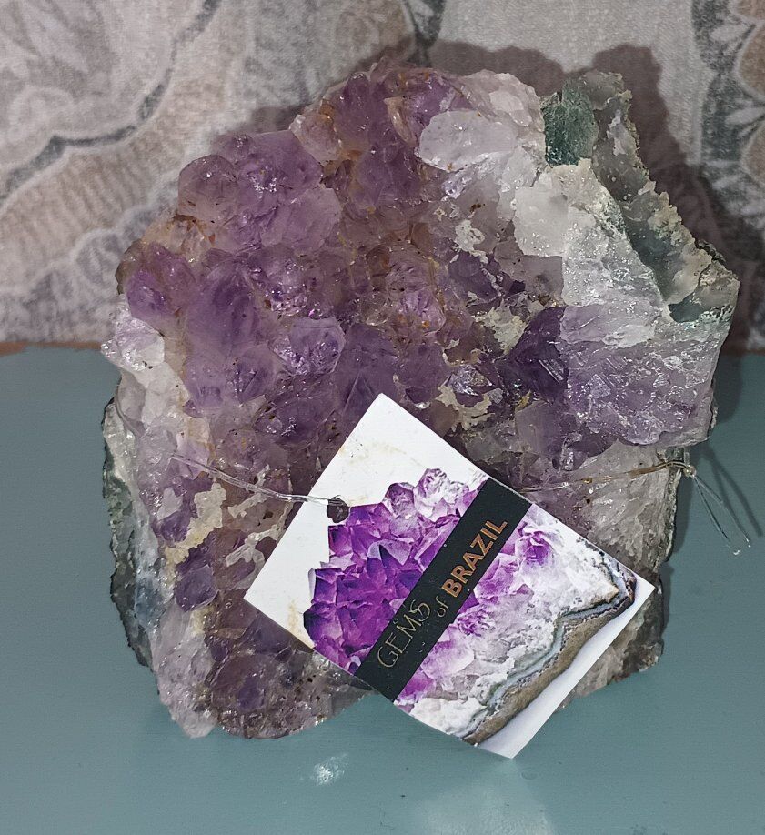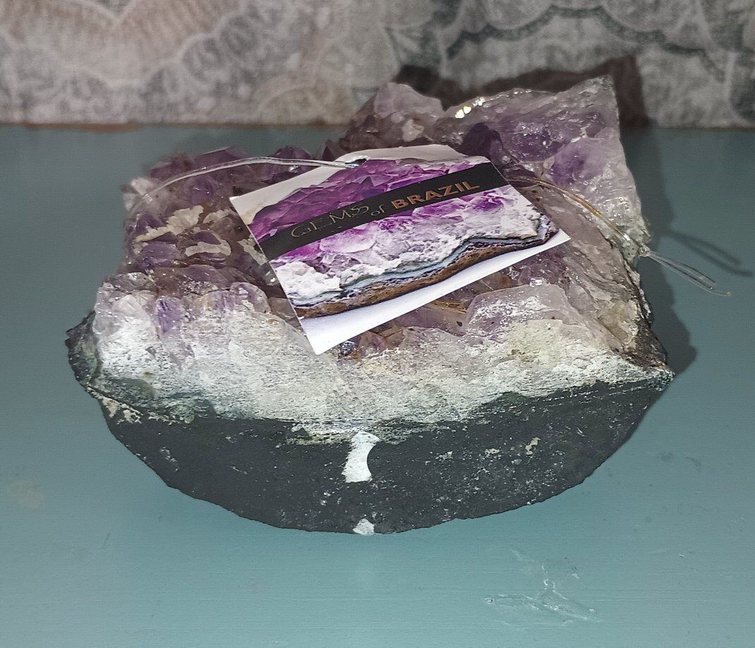 Brazilian Amethyst Purple Quartz Cluster Brand New 1lb 8.5oz 4x4.25x2.25 inches approximately Authentic! Intensify the beauty, brilliance, harmony and peaceful vibrations in your home. Purple quartz, also known as amethyst, promotes peace, intuition, and spiritual growth. It's associated with the crown and third eye chakras, encouraging higher consciousness and spiritual insight. Amethyst is also offers protection from negative energies and to aid in healing, particularly emotional and spiritual healing.