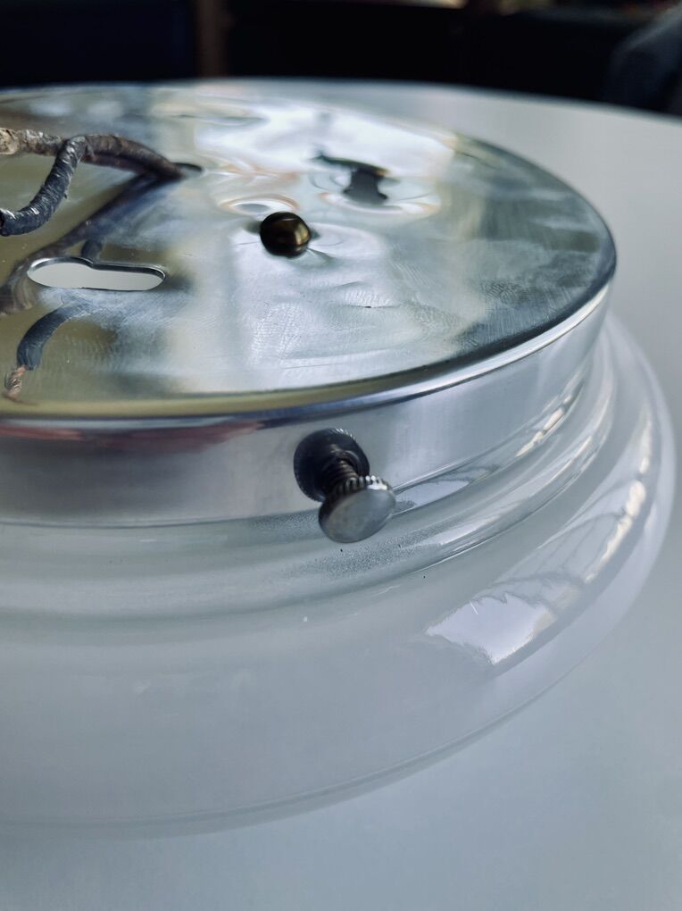 Selling a vintage mid-century modern mushroom light fixture in working order. The base is a polished aluminum and the shade is thick white glass. Fixtures can be hung on the ceiling or the wall…it is hardwired. Roughly 8” in diameter.