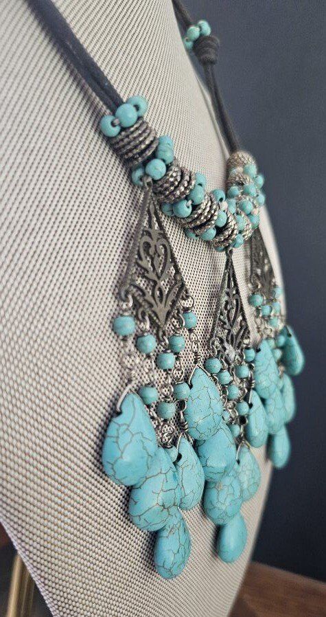 Showy, dangly & flirty artistic turquoise tear drops necklace. This piece is well made with fifteen beautiful spider web turquoise tear drops in groupings of three and 81 complimentary round matching beads. It measures 16" or 22" from top to bottom with a large lobster closure for easy on & off. The additional 3" extension gives you the option to wear this under or over.