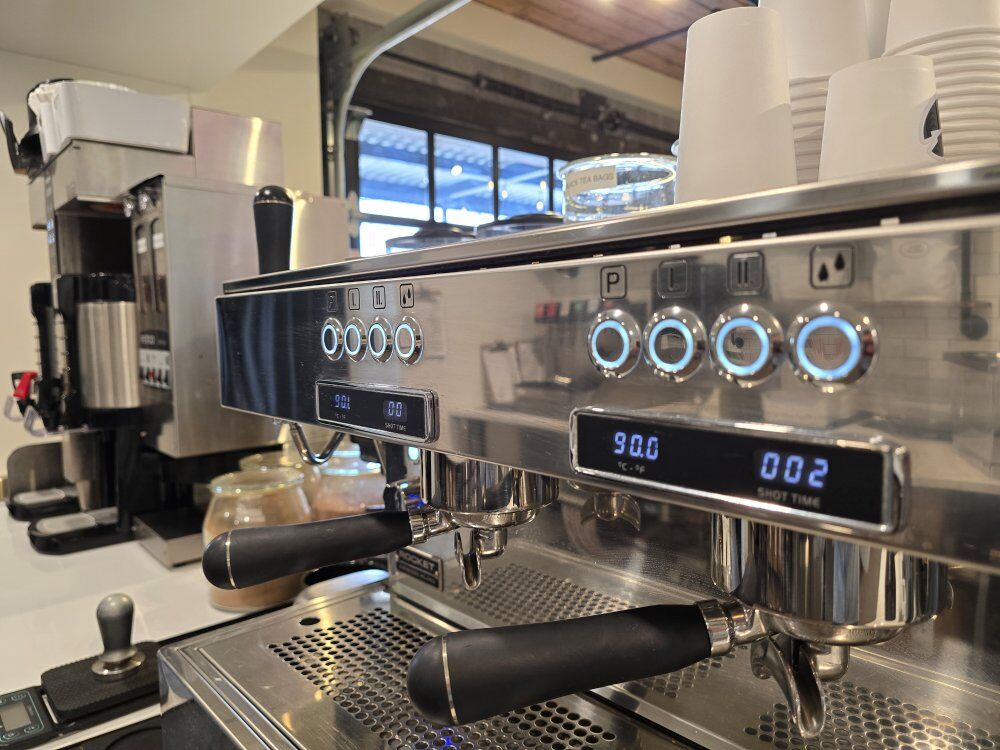 The digital display enhances precision, allowing for boiler temperature adjustments in increments of 0.1 degrees Celsius and providing individual shot timers for each group.