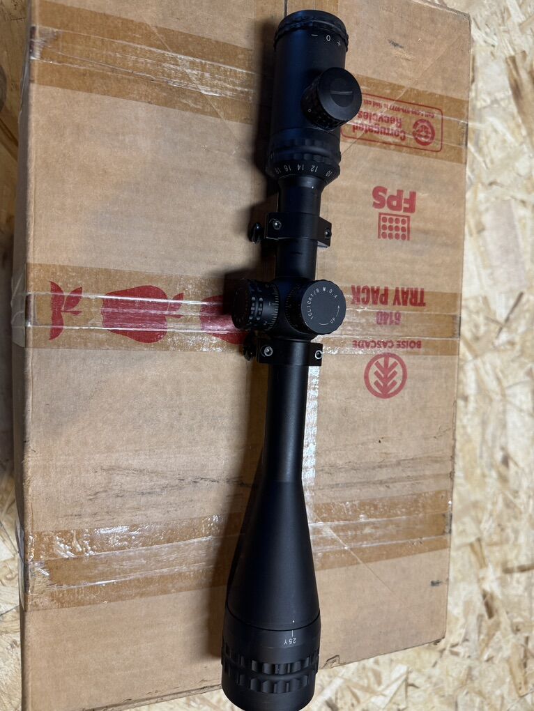 Trinity Force 10-40X50 AOE Scope. Mounted on my HMR .17 and was dead on every shot. It is pretty long and a little heavy so wasn’t really into it. Nice inexpensive scope - $75
