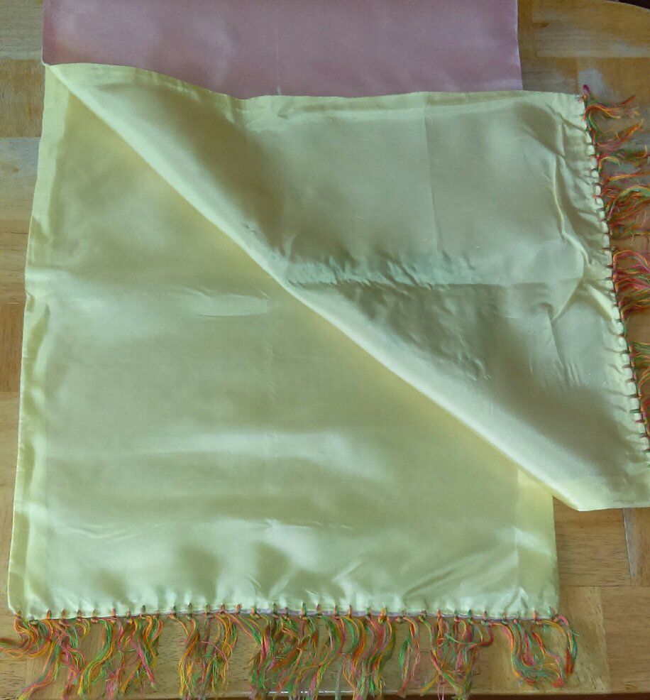 $10, Silk table runner measures 45" long with the fringe x 15". The design is embroidered and covered on the back with yellow silk.