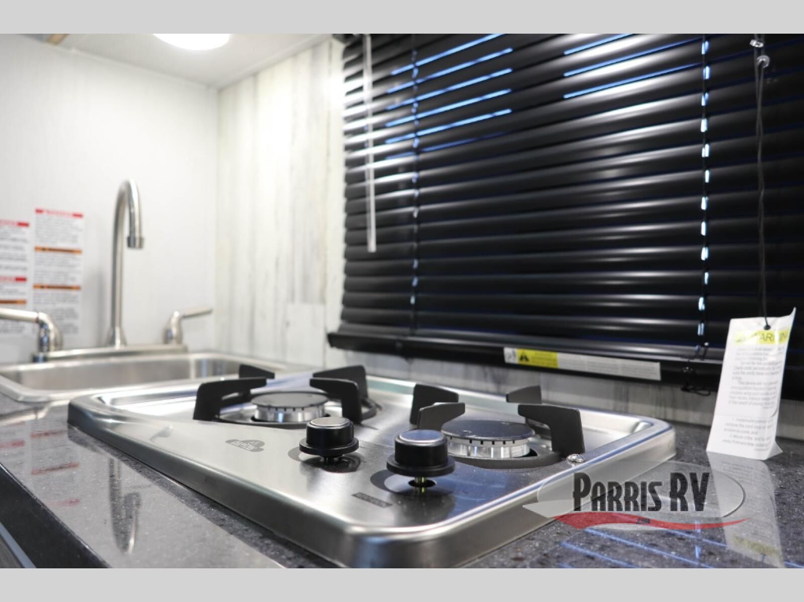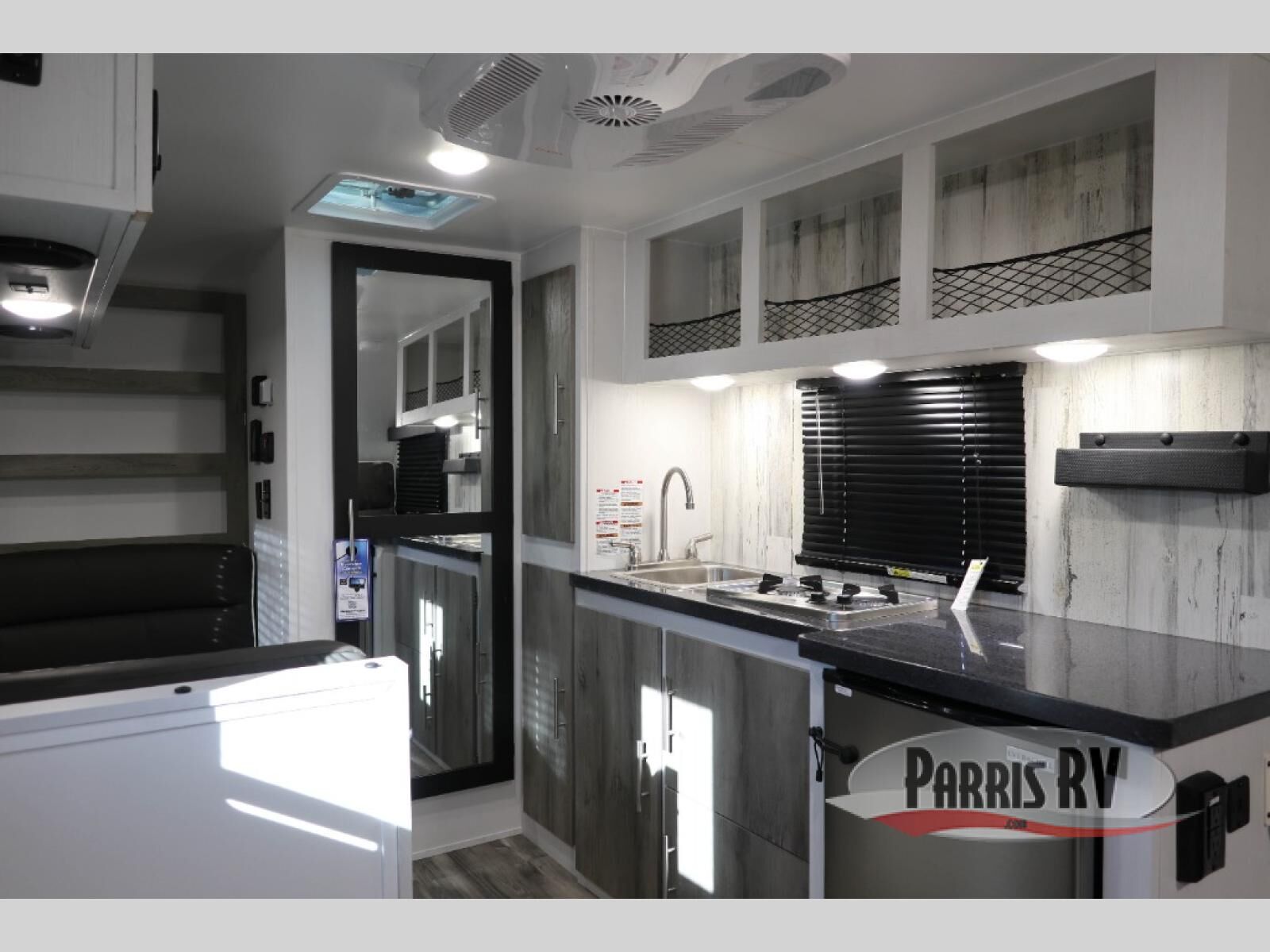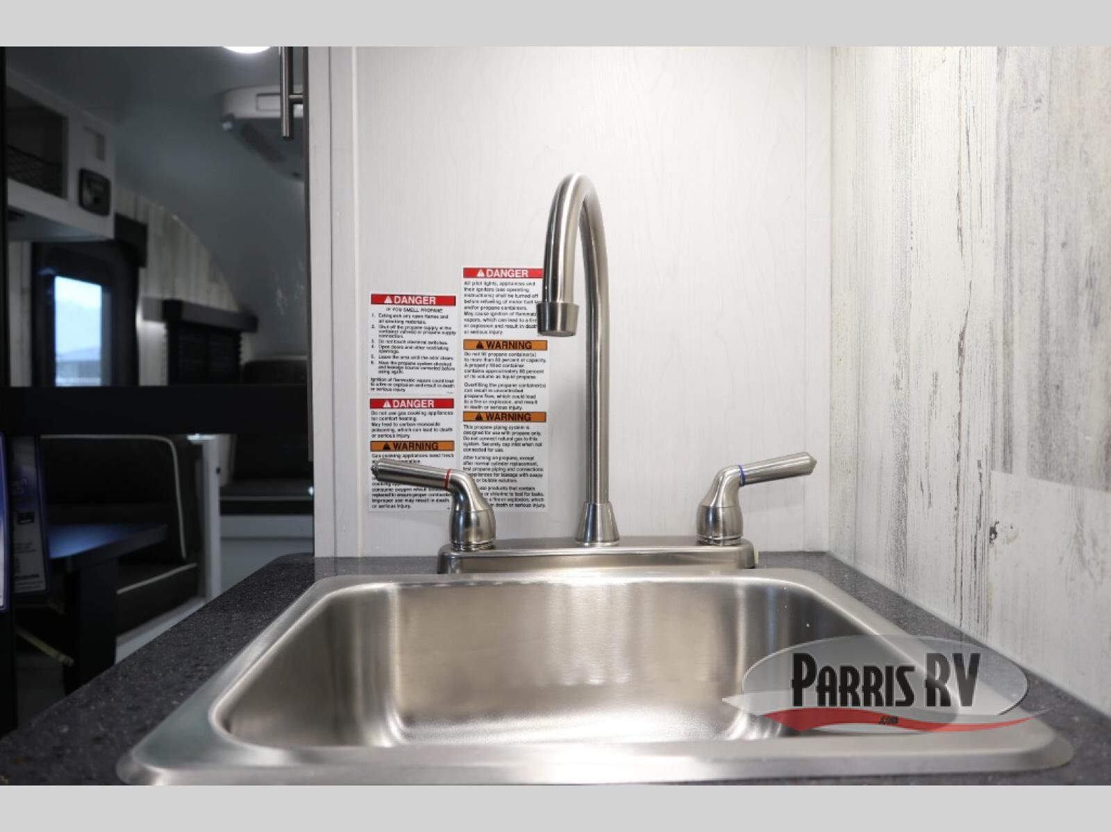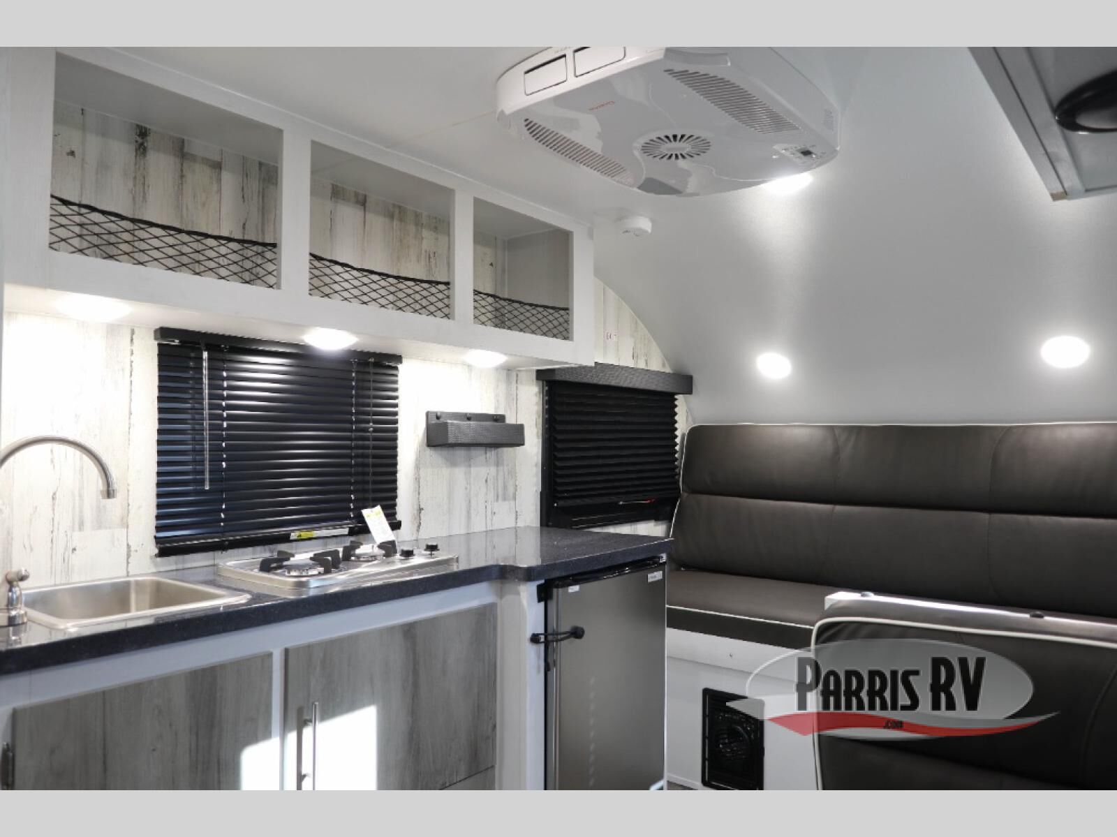 Head to your favorite campgrounds with your favorite person in this travel trailer! Relax each evening in true comfort on the front sofa while enjoying a snack that was stored in the kitchen pantry, and the sofa transforms into a full bed for sleeping at night too. The two person dinette offers a comfortable place to play games and enjoy your meals at that were prepared using the two-burner cooktop, 3.3 cu. ft. 12V refrigerator, and single bowl stainless steel sink. There are shelves and overhead cabinets throughout to store your items, and a rear corner wet bath to freshen up in each morning with a fantastic vent to eliminate any unwanted steam!
