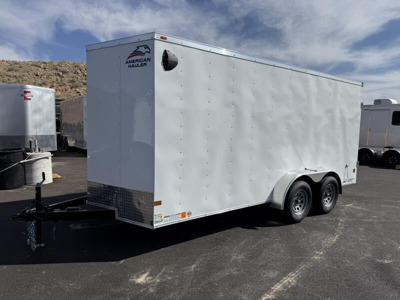 Stock #: AH0023 Trailer Specs: Color: White .024 Aluminum Door/Ramp: Rear Barn Door Weight: 2,300 lbs. | GVWR: 7,000 lbs. | Payload: 4,700 lbs. Axle(s): 2-3,500 lb. Dexter Spring Electric Axle w/ EZ Lube Hubs Tire/Wheel: ST205/75R15 | Load Range C Coupler: Type: Bumper Pull | Size 2-5/16" | 7-Way 12V Connector 16" OC Vertical Posts | 16" OC Crossmembers | 24" OC Tube Roof Bows 1 Year Limited Warranty Standard Features: 2"x4" Tube Main Frame 1-Piece Aluminum Roof 16" Starbright Stoneguard 1/8" Economy Sidewall Liner 3/4" PlexCore Flooring (4) 500 lb. Wall Mounted Rope Rings 32" Side Door w/ Bar Lock Flow-Thru Sidewall Vents 12v Interior LED Dome Light 12v Exterior LED Lighting Smooth Aluminum Radius Fenders Undercoated Chassis Common Addons: Wall Mounted Spare Tire 10 ft. E-Track Stick Recessed 2,500# D-Ring WASATCH TRAILER SALES - LARGEST TRAILER SELECTION IN UTAH Hurricane: (435) 239-8920 | 6477 W Foothills Canyon Dr. Hurricane, UT 84737 View More Inventory: www.wasatchtrailer.com Over 2,000 trailers in stock at Wasatch Trailer Sales! With three convenient Utah locations - Layton, Springville, and Hurricane - finding the perfect trailer has never been easier. We offer one of the largest inventories around, backed by quality you can trust, superior value, and unparalleled pricing. Don't see exactly what you need? Call or text 435-239-8920 with 20+ top manufacturers and easy financing, we'll get you on the road fast! Whatever you haul, we've got the right trailer - in stock year-round!