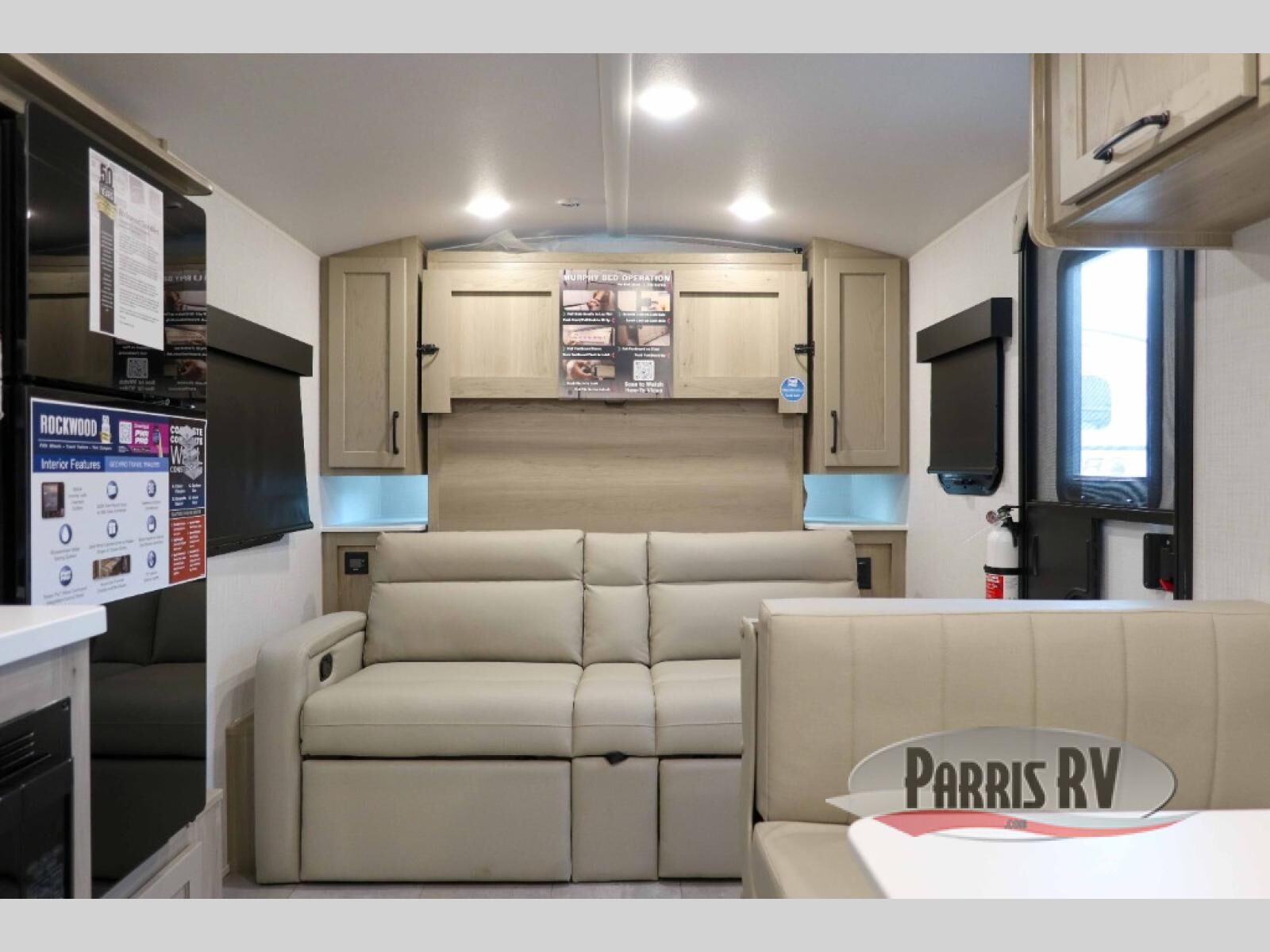 Comfortable sleeping space, convenient seating space, and a full rear bath makes this couple's trailer the one! You will love being able to relax on the sofa during the day, and sleep on the Murphy bed at night. There is a single slide out that will provide you more space to move around or cook meals, and the full bath includes a large shower so you won't feel cramped. If it's a rainy day you can watch movies on the 32" 12V TV, and if it's nice out, sit under the 14' power awning and cook lunch on the outside griddle. The possibilities are endless with this couple's trailer! The optional Power Package available on this model gives you the option to go off-grid for even longer amounts of time!