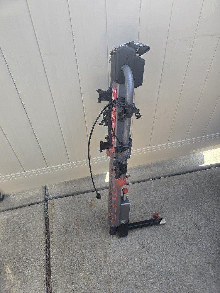 Yakima Highlite 3 bike Receiver hitch mount bike rack. one of the lightest receiver racks ever made. Under 20 pounds. Folds at the top and bottom of the mast for convenient access to the back of your car. It has the built in locking cable and key. Most of the world straps are there, but missing a couple. Super light and easy to lift on and off your vehicle. 1 1/4 receiver, but you can get a $20 adaptor from Yakima to do 2" receivers also.