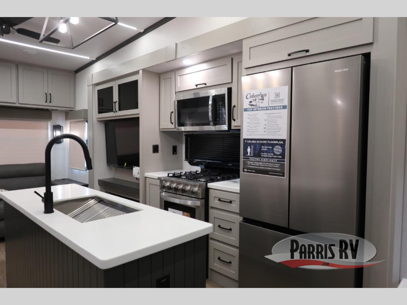 Experience a different camping life with residential furnishings and high end features in each one of these Palomino Columbus fifth wheels! The 101" wide body lets you walk around more throughout and the all-welded aluminum-frame superstructure has a snap-in ceiling molding to hold up through every adventure. Don't leave any of your gear behind either when you can easily store it in the climate controlled drop frame storage area. On the exterior, you'll find a heated utility convenience center, an outside sprayer to keep the dirt outside where it belongs, and magnetic compartment door holds to keep them from falling on you as you grab your items. Plus, there are some modern features that will really seal the deal like the Wi-Fi Booster with 4G LTE capability prep, upgraded true solid-surface countertops, power theater seating with USB charging, and a 260W solar panel for off-grid camping!