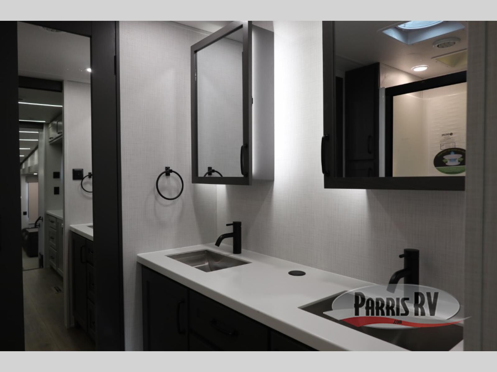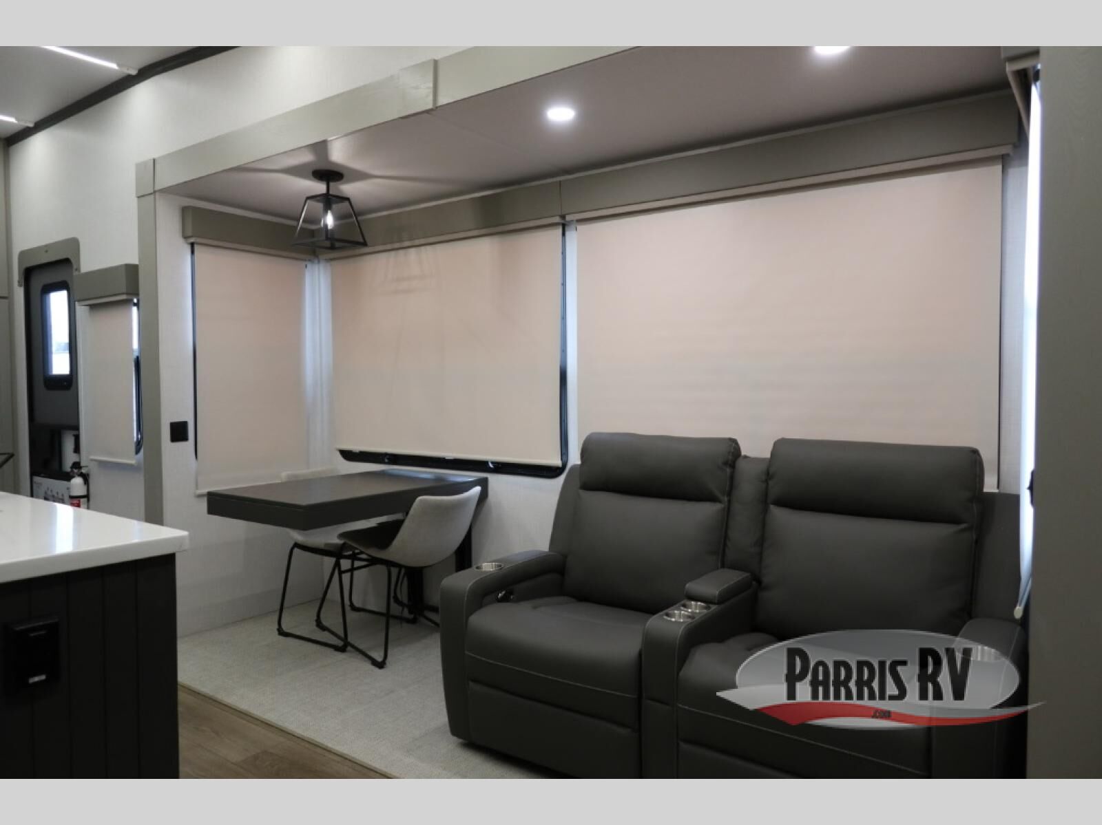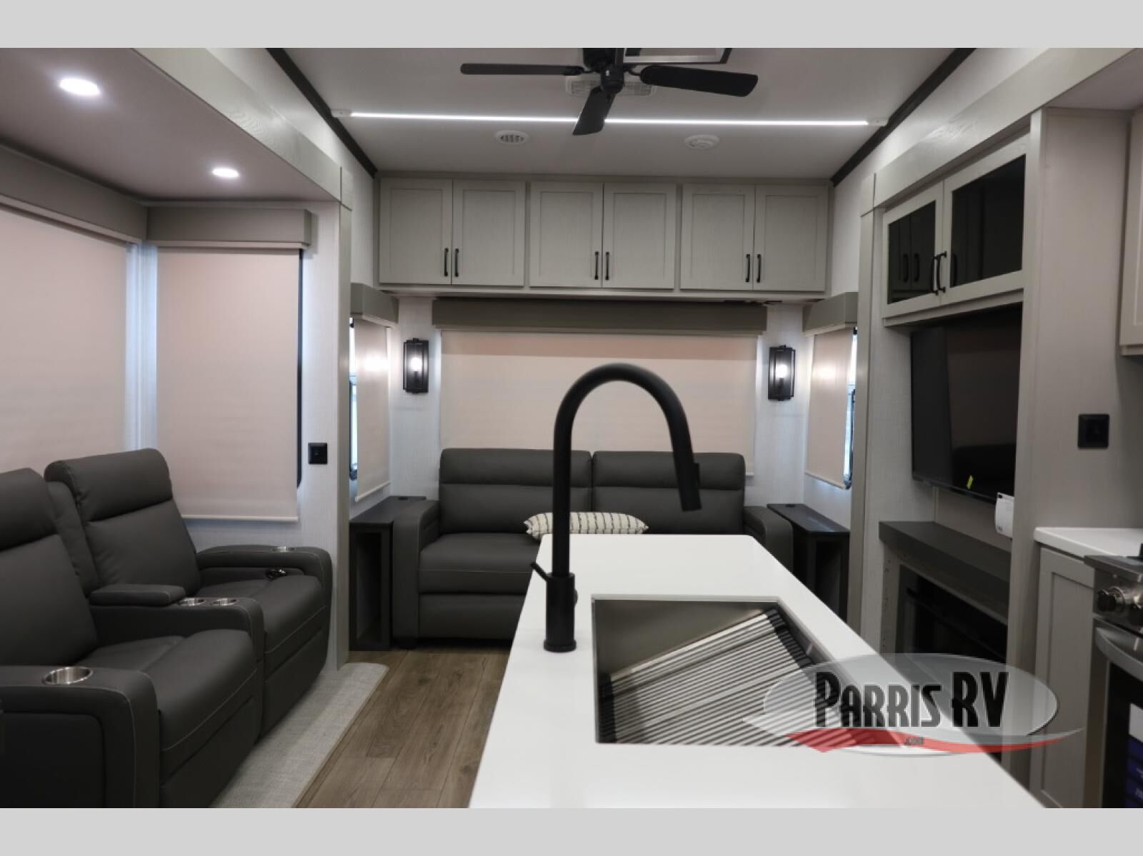 Everyone will stay clean with a bath and a half in this fifth wheel! The kitchen has a pantry big enough for everyone's favorite snacks, a four burner gas cooktop, and a kitchen island to prepare your best meals. You can have game night indoors at the table and chairs or set up a table and chairs underneath the two power awnings. The rear living area offers a comfortable place to watch the big game too with an sofa/sleeper and theater seating directly across from the entertainment center with a 50" Smart TV and fireplace. Two can get ready at once in the front bathroom featuring a vanity with dual sinks, and since there is washer and dryer prep, you have the option to make wash day easier!